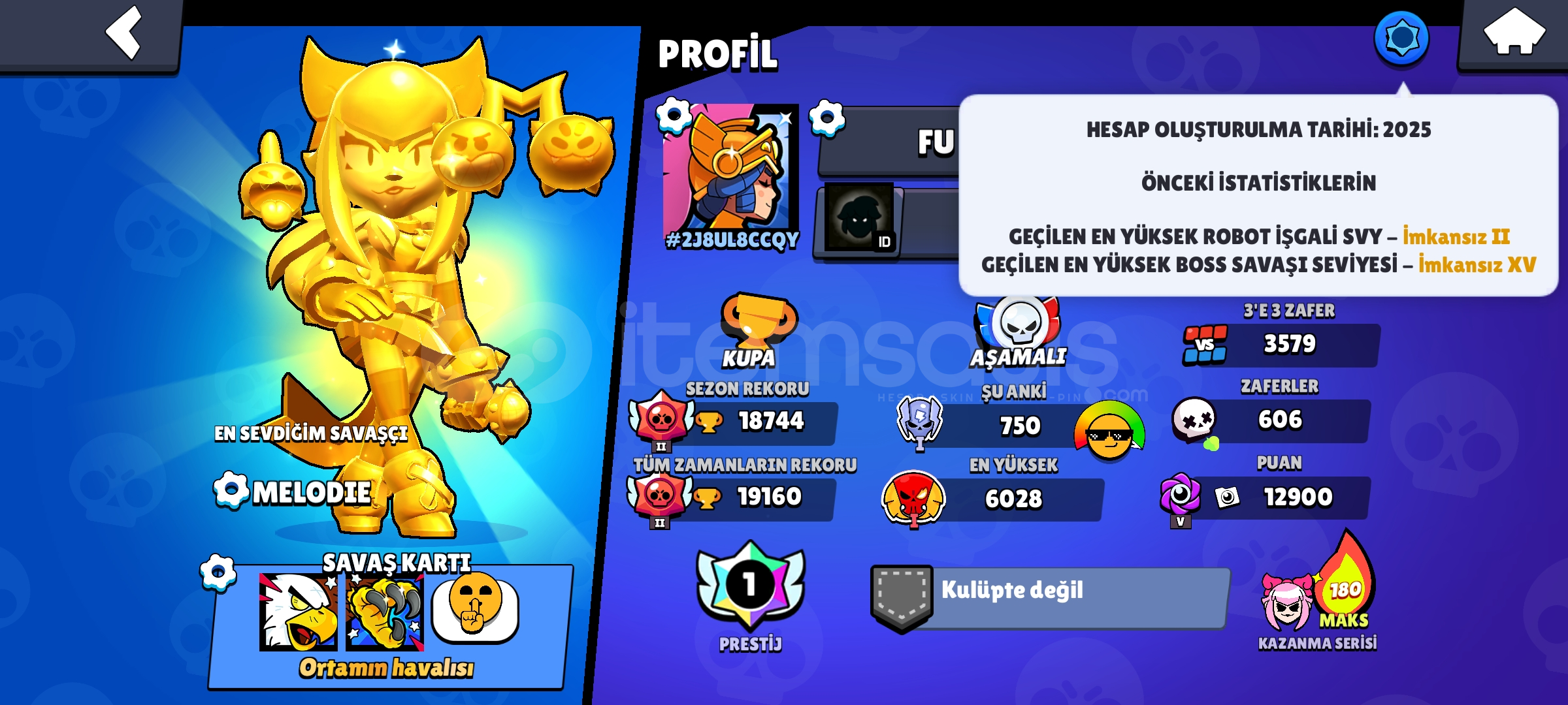 PRESTİJLİ MÜKEMMEL 2025 HESABI!!! HESABA 5000-6000₺ PARA YATIRILMIŞTIR. 1909 STU İLE PRESTİJ ALINMIŞTIR. HESAPTA ALTIN MELODİE MEVCUTTUR. 2 SEZON PRO PASS AÇILMIŞTIR. 10-15 TANE ÜNVAN MEVCUTTUR. (HESAP -5900 ELMASTIR) ELMAS -DE OLDUĞU İÇİN ÇOK UYGUN FİYATA SATILIKTIR. MAİL ADRESİ DEĞİŞİYOR, TELEFON NO BAĞLI DEĞİLDİR. (HESABI SATIN ALINDIKTAN SONRA HEM...