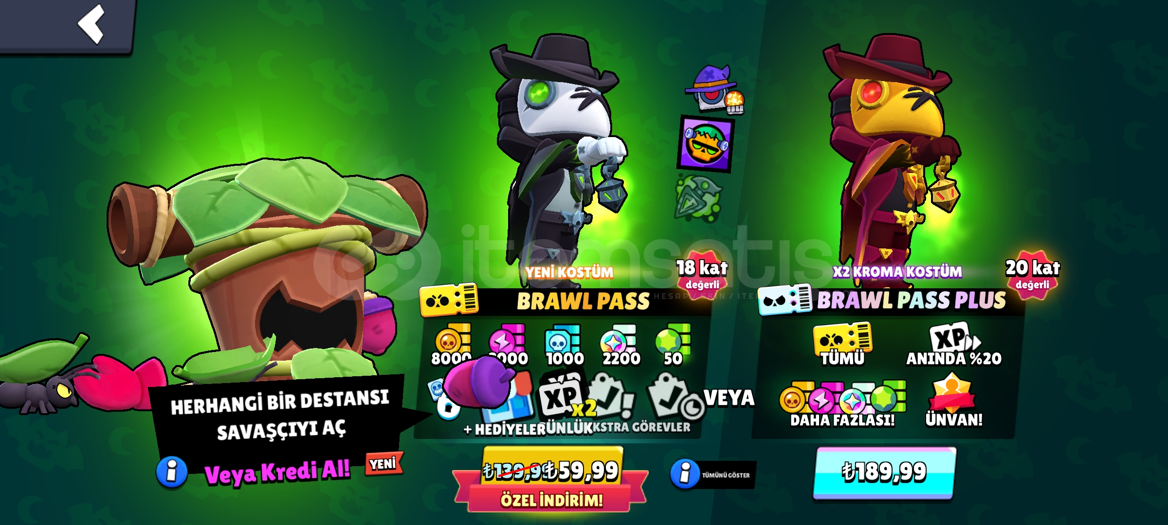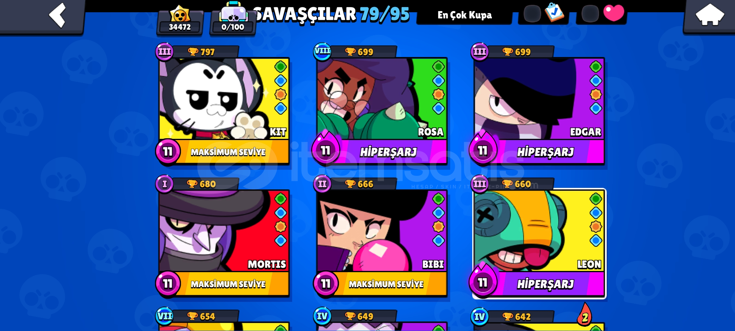 Brawl Stars-34K 3 tane BPP Alınmıştır 79 Karakterdir 11 tane makximum ve bunların 6 tanesi hiperşarjlıdır 11 seviye olmayan birkaç hiperşarjlı da vardır 104 Kostüm vardır hesap2019 da kurulmuştur 6260mücevher vardır hesapda brawl pass indirimi vardır 60 tl Hesap boş bir gmaildedir hesap alıcısına gmail hesabı ile verilecektir