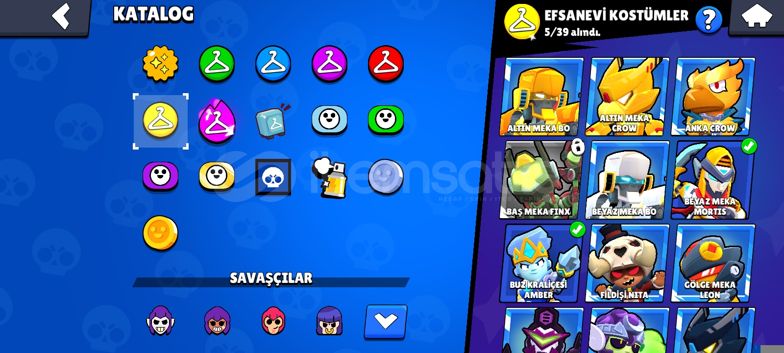 178 kostüm 233 taş 7 unvan 75 karakter 30 k 1500 TL para yatırılmıştır içinde çok iyi kostümler ve mortisin nerdeyse bütün kostümleri vardır beyaz kurt Leon buz kralicesi amber riconun bütün kostümleri nerdeyse var kabus sandy mavi kaptan Carl