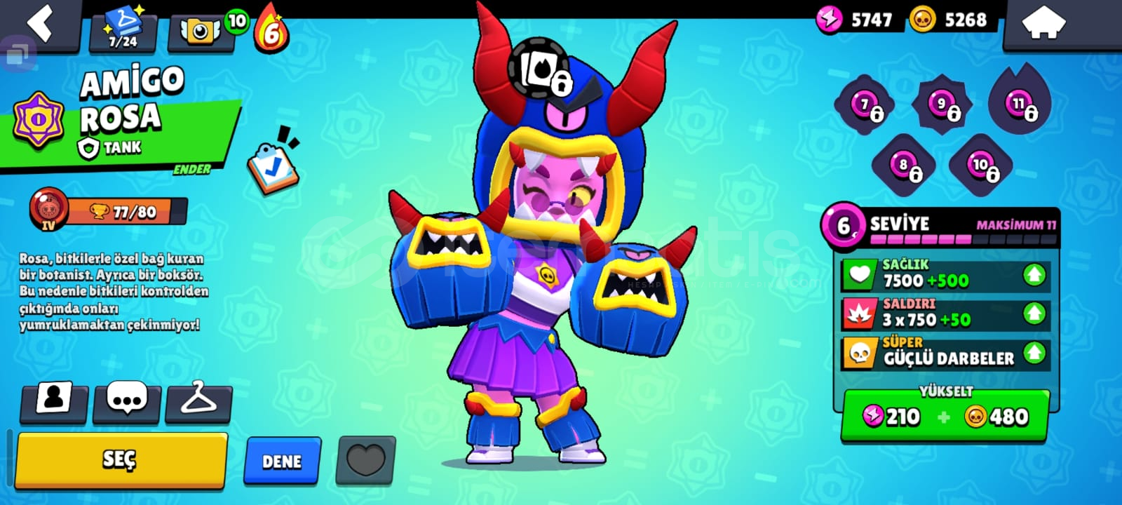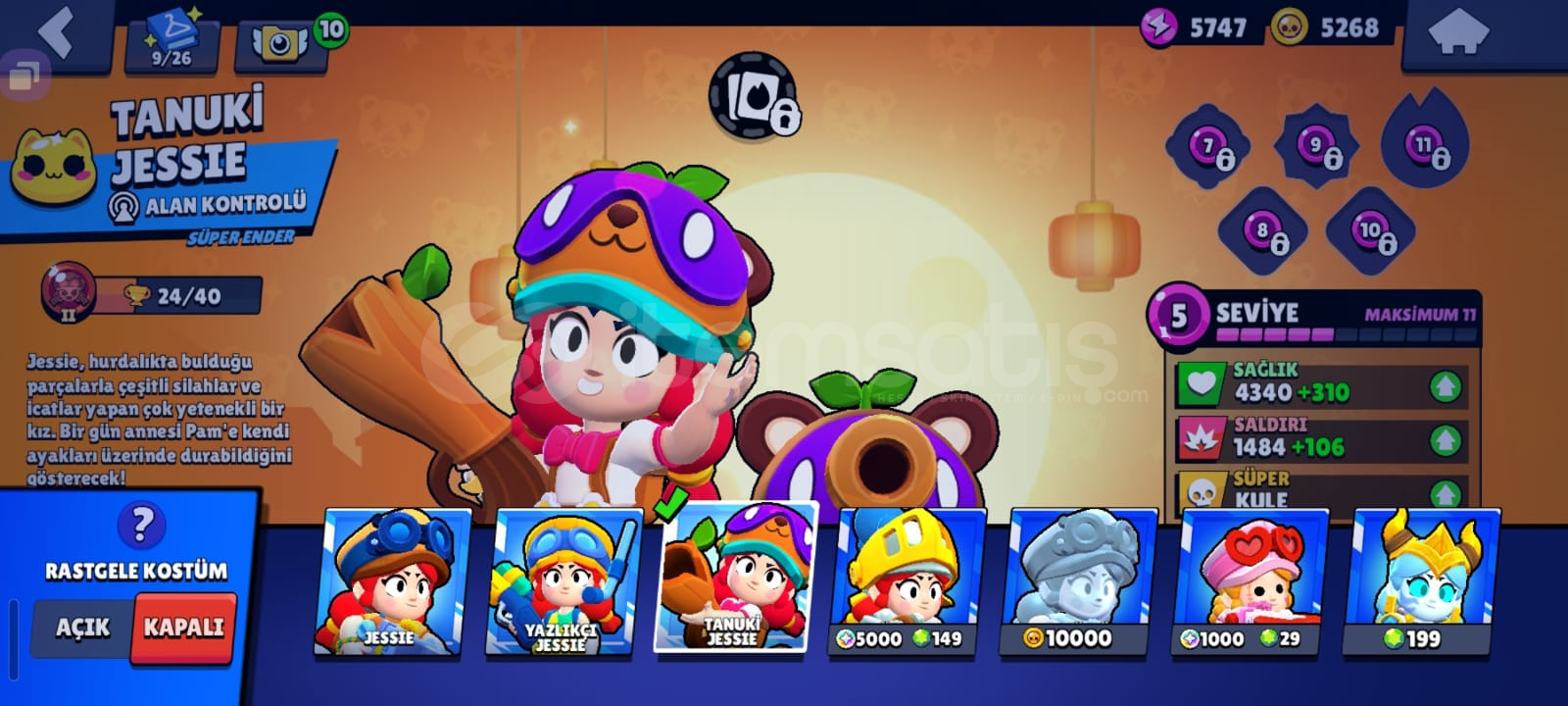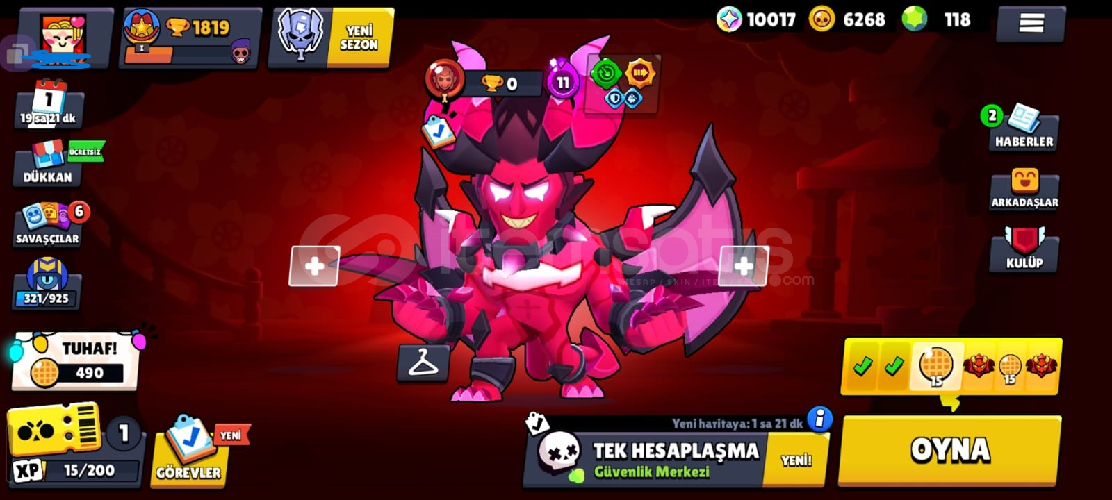 Hesapta 118 elmas, 10017 mücevher, 6268 altın vardır.1819 kupadır.7 süper ender, 7 destansı ve 1 hiperşarj skini vardır.Ücretsiz isim değiştirme hakkı mevcuttur.Hesabın bağlı olduğu mail adresi verilecektir.