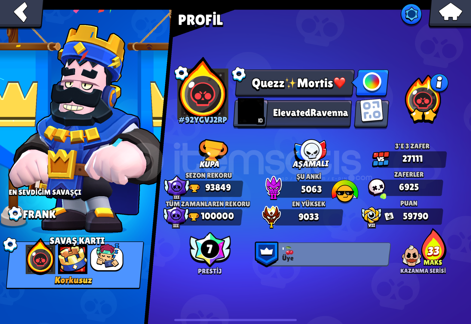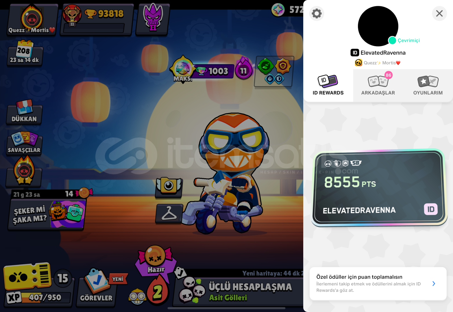 -YOUTUBE KANALIYLA BİRLİKTE VERİLECEKTİR.CREATORLUĞA AZ KALMIŞTIR-8555 ID REWARDS PUANI VARDIR.BP PLUS 200 TL,ELMASLAR İNDİRİMLİ-TOPLAM 428 KOSTÜM BULUNMAKTADIR.BİRÇOK NADİR KOSTÜM VARDIR-7 KEZ PRESTİJ ATILMIŞTIR-3v3 ZAFER SAYISI 27.111 DİR-2024 MASTER BULUNMAKTADIR-ARKADAŞLIK LİSTESİNDE BİRÇOK PRO KADEME UZAYLI ŞÖHRETİ 2 OYUNCULAR EKLİDİR-YENİ GELE...