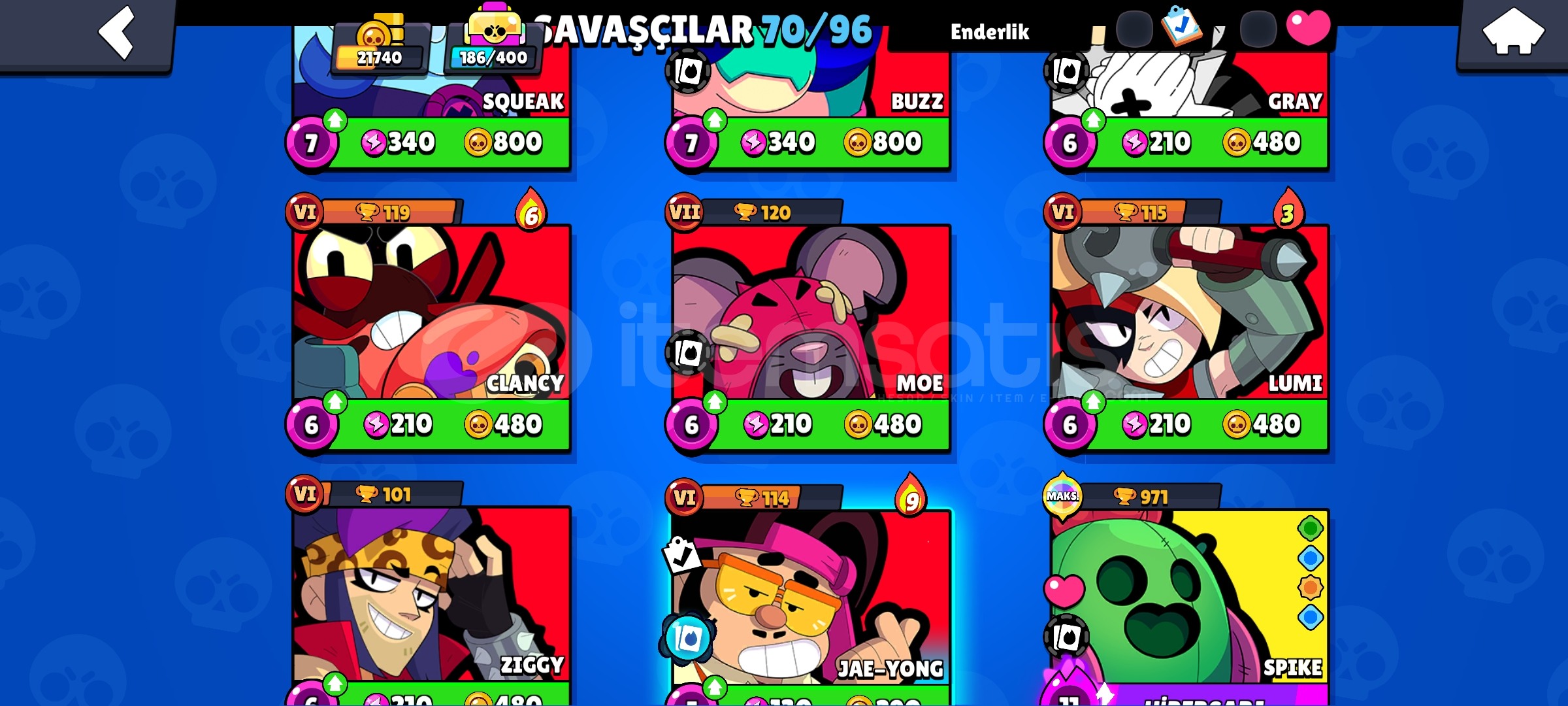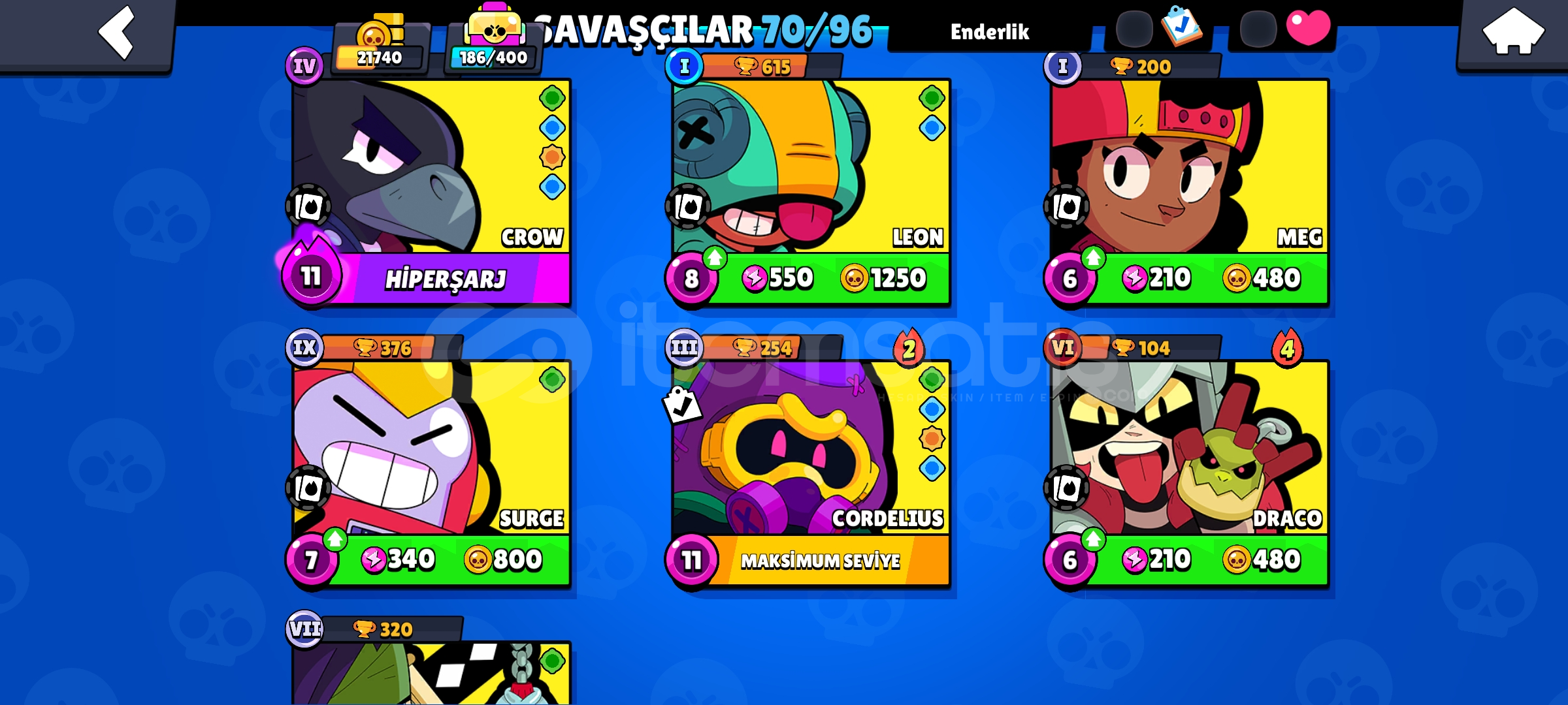 TERTEMİZ HESAPTIR MAİLİNİZE DEVİR EDİLİR..BOMBA KOSTÜMLER MEVCUTTUR HESAPTA BAYA KOSTÜM MEVCUTTUR.KORSAN POCO MEVCUTTUR2 DEFA BRAWL PASS AÇILMIŞTIR 1 TANE UNVAN MEVCUTTUR ( RIP ) 21.740 KUPADIR 70 KARAKTERDİR BU KUPADA BÖYLE KARAKTER BULMAK ZOR.. 8 ADET EFSANEVİ KARAKTER MEVCUTTUR.KISACA ALICISINA HAYIRLI OLSUN BU FİYATA BÖYLE DOLULUKTA HESAP BULAMAZSINIZ ARKADASLAR