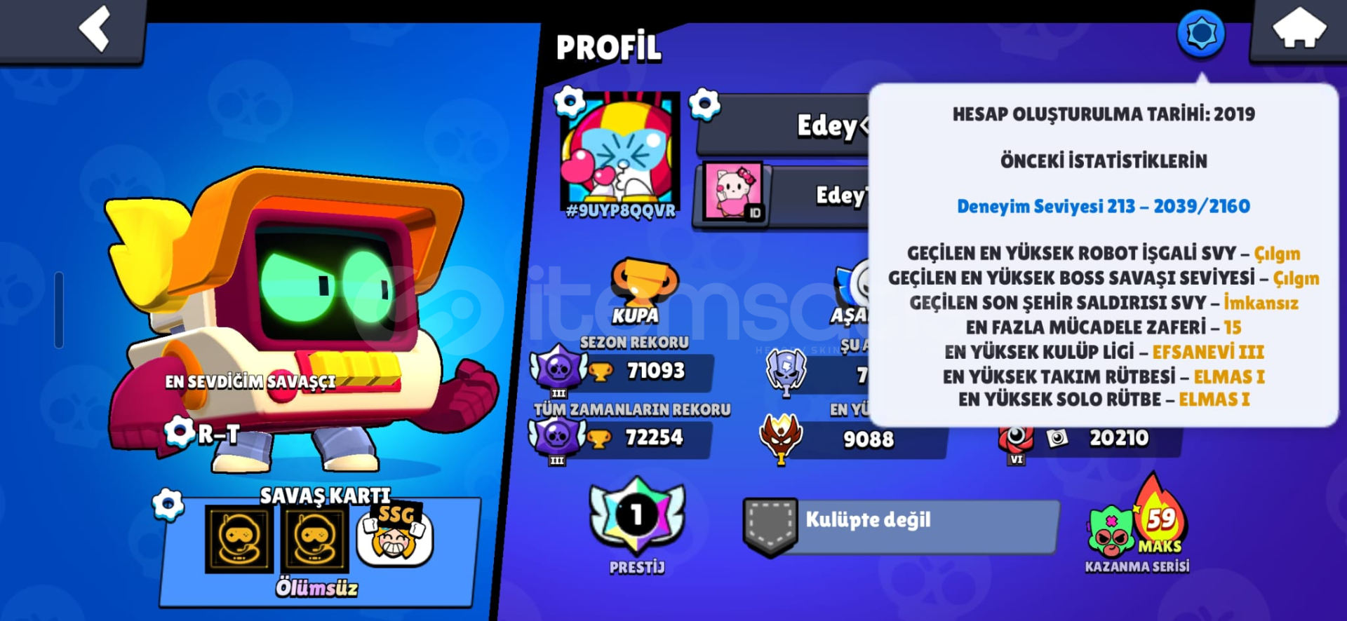 Hesap SSg acedemy hesabıdır son 6-7 aydır aktif olarak oynanmadı ara sıra girildi prestij vardır eski sistem master 2019 hesabıdır nadir skinler vardır fiyatta pazalık payı olur 91 karakter 54 tane max karakter vardır E spor sekmesi açıktır 70k+ kupa max 73kyı gördü