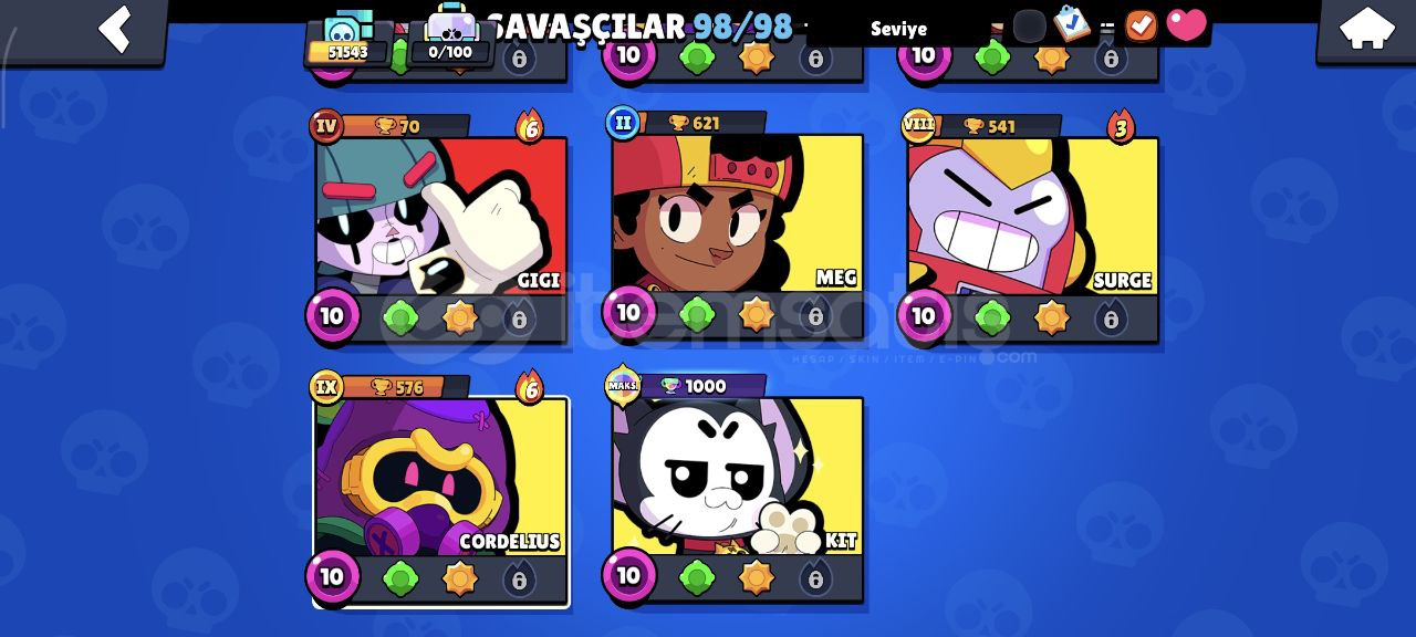 Hesap Özellikleri:98/98 Karakter, Hepsi +10 seviye, 48 tanesi 11 seviye!54 Hiperşarj (hepsi kullanılabilir durumda)160/196 Yıldız Gücü163/196 Aksesuar122 Eşya 92 Ender kostüm70 Süper ender kostüm125 Destansı kostüm13 Gizemli kostüm19 Efsanevi kostüm5 Hiperşarş kostümü (Şeytan Mortis ve Kara Melek Edgar'da aralarında var.)→Toplam 324 adet! Tüm Buffie'ler açık ve...
