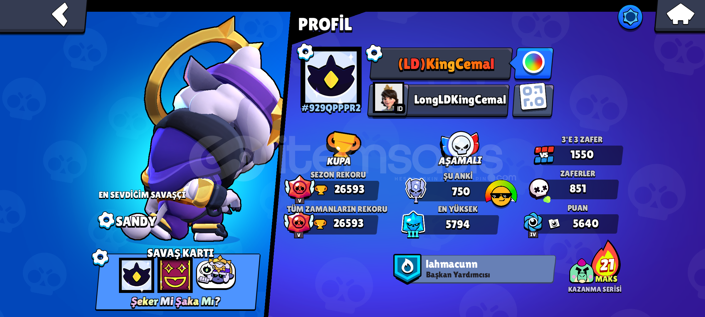 🎮 Brawl Stars Hesabı Satılık!🏆 Kupa: 26.593👑 Kostümler:3 Efsanevi39 Ender37 Süper Ender45 Destansı3 Gizemli✨ Özellikler:4 kez Brawl Pass alınmışYeni sezon Brawl Pass kostümleri ve rozetleri mevcutE-posta değiştirilebilir, hesabınız tamamen size özel yapılabilir💥 Fırsatı kaçırmayın! Güçlü ve renkli bir hesap sizi bekliyor!