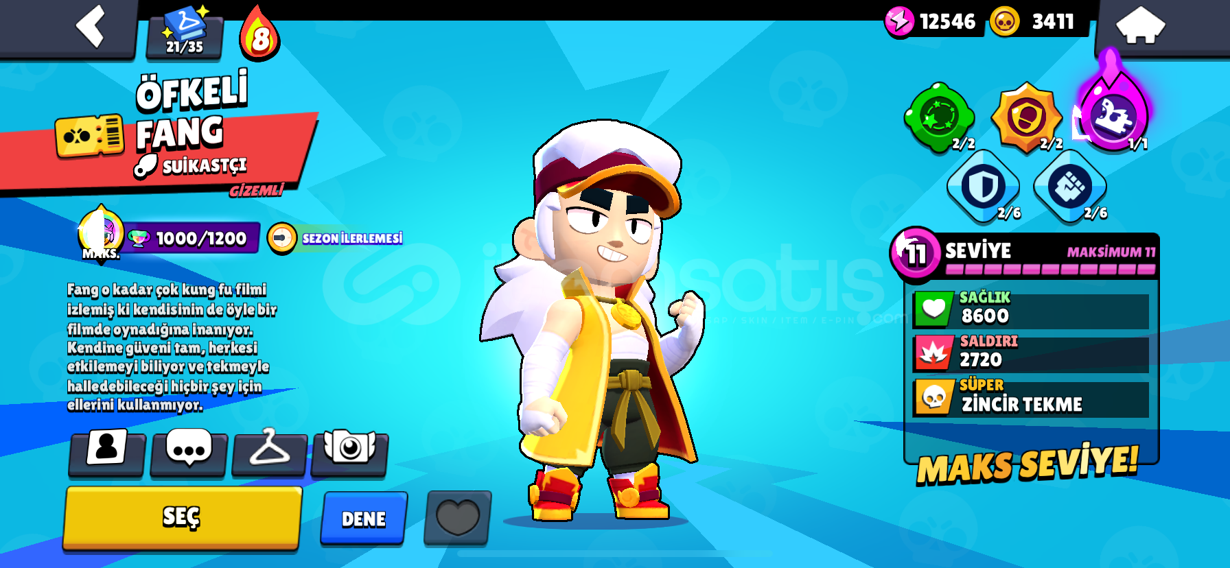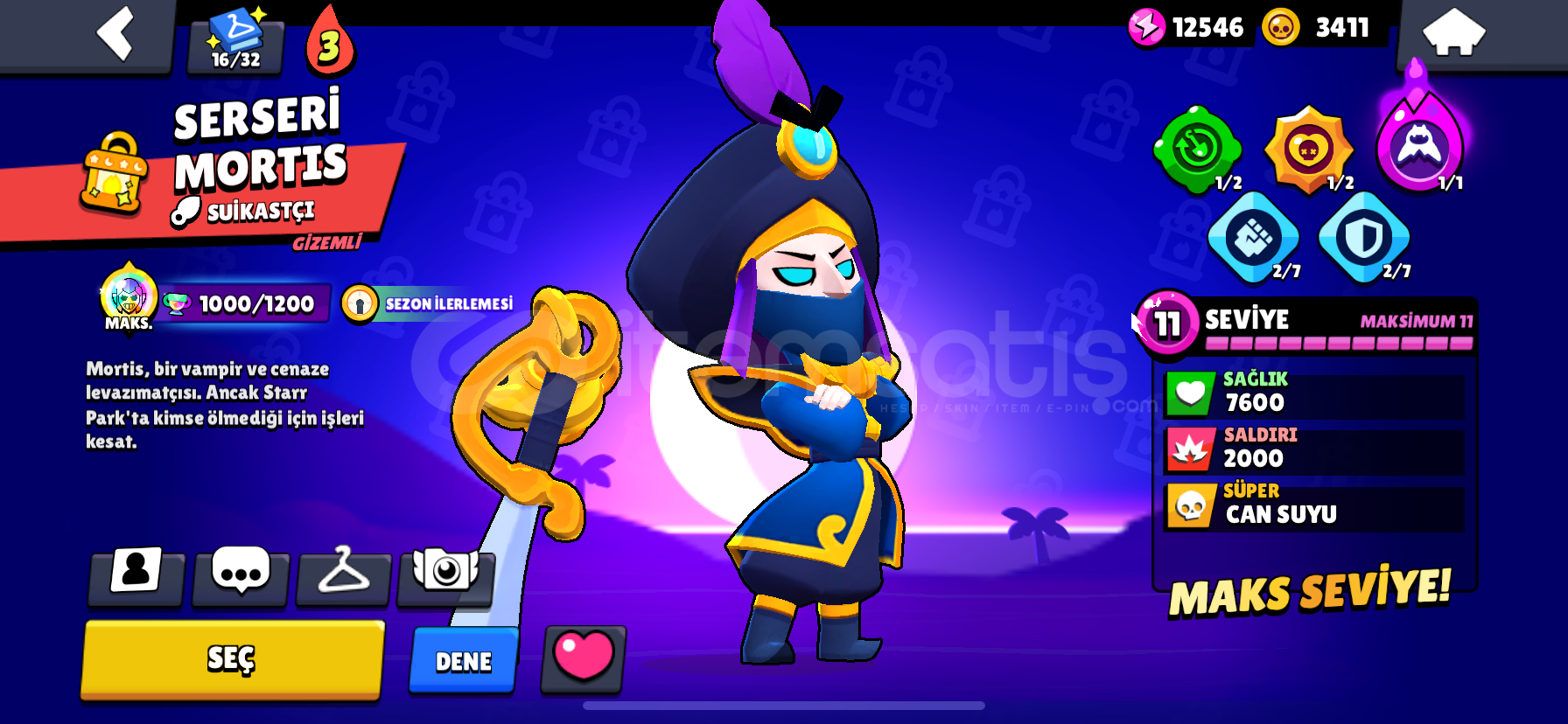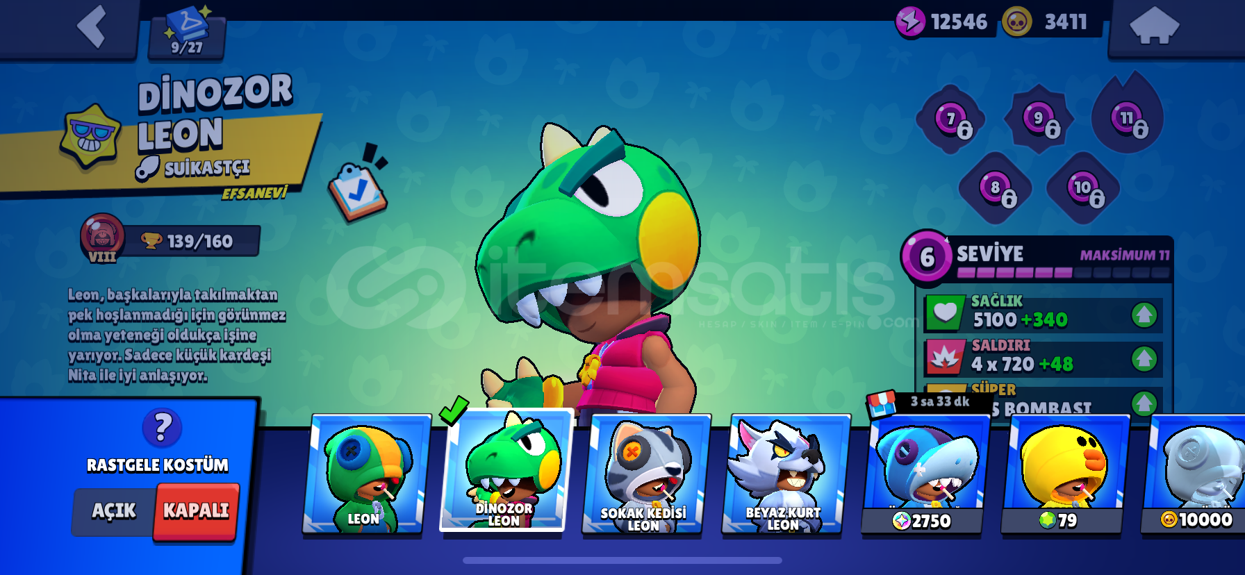 12000.kupa ve her karaktere ait en az 1 tane gizemli kostüm vardır hesapta.bp açılmış zamanında.kupası az olsada kostüm olarak çok değerli hesaptır3 adet 1000 kupadan fazla kasılmış ve güncel 1000 kupa olan karakter vardır