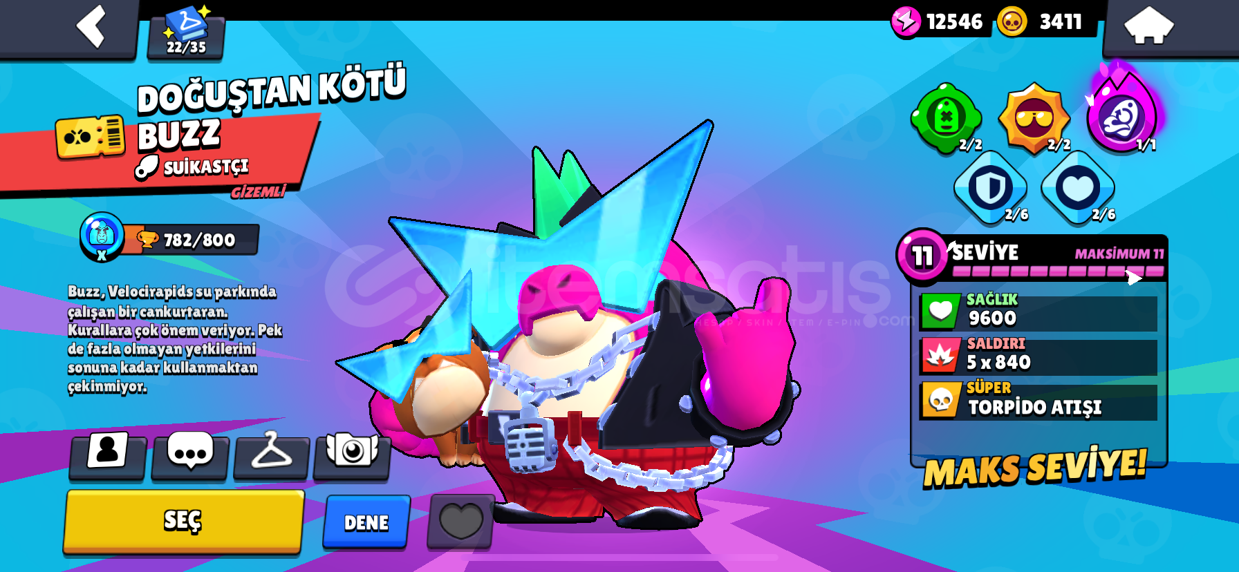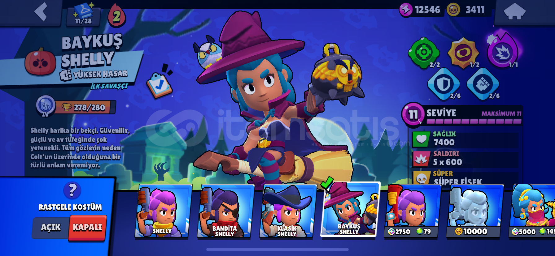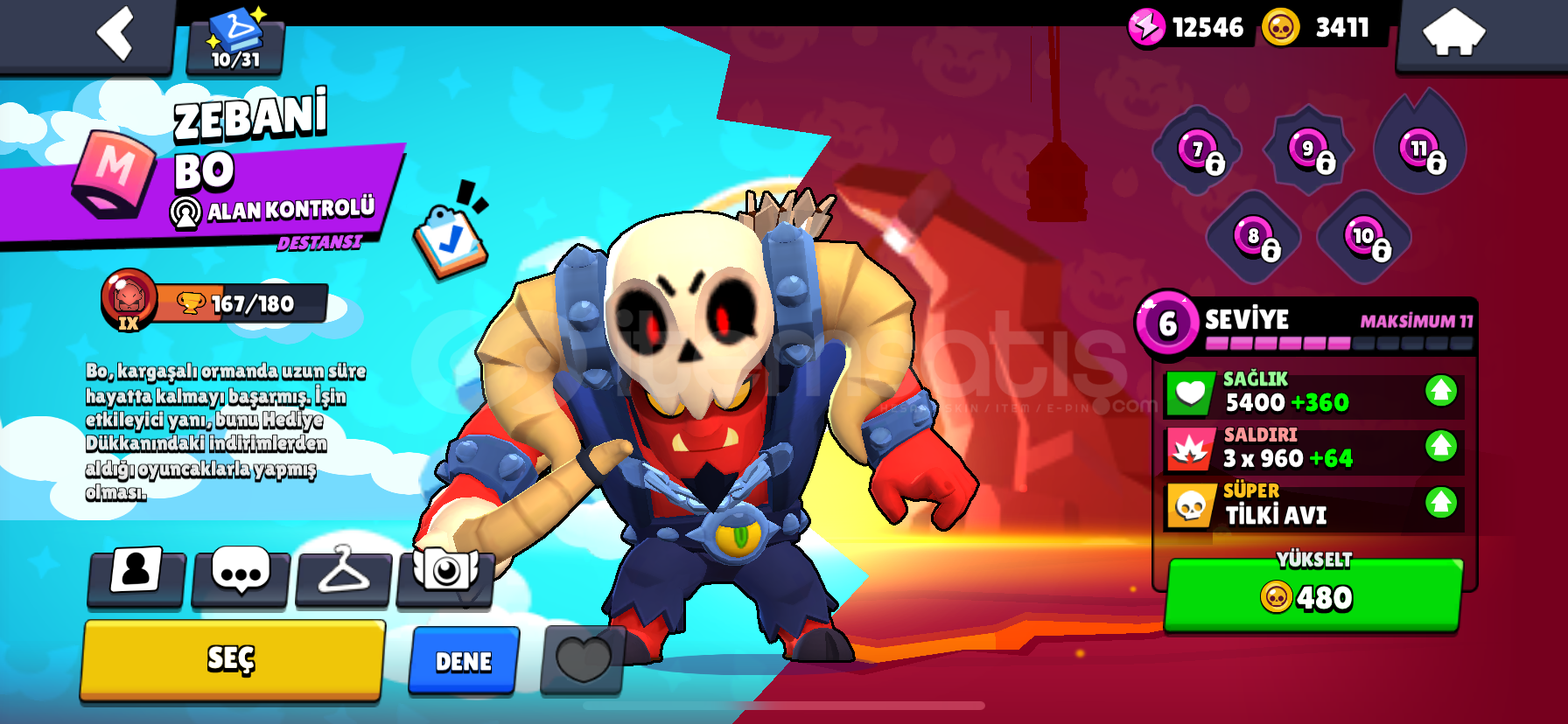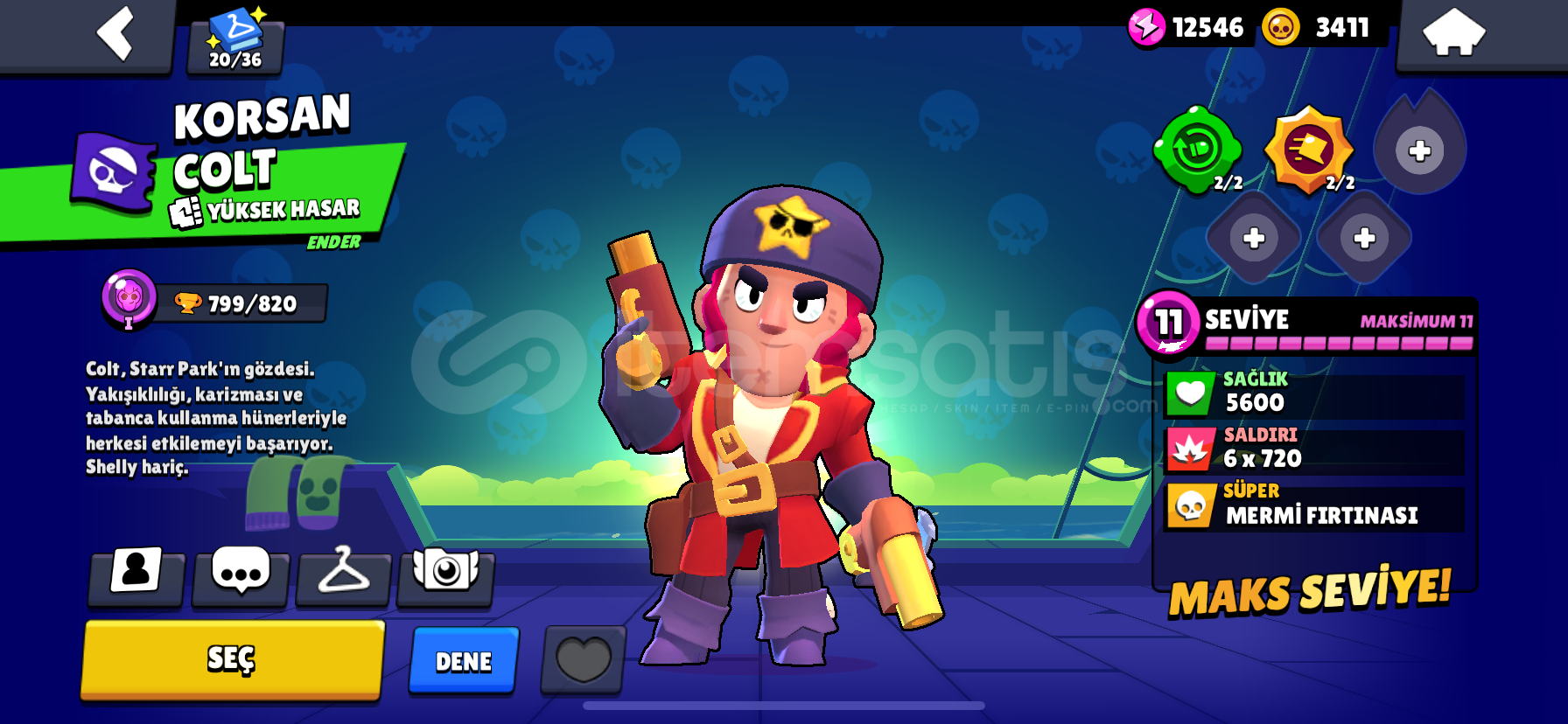 12000.kupa ve her karaktere ait en az 1 tane gizemli kostüm vardır hesapta.bp açılmış zamanında.kupası az olsada kostüm olarak çok değerli hesaptır3 adet 1000 kupadan fazla kasılmış ve güncel 1000 kupa olan karakter vardır