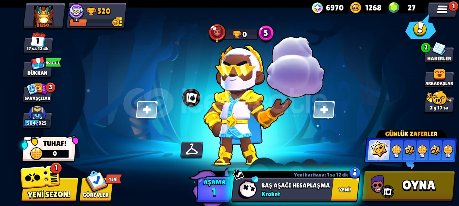 15 ender13 super ender7 destansı2 gizemli * zeus brock , baykuş shelly1 hiperjarj skini.24 karakter.520 kupa3 max karakter mevcuttur hepside hiperlidirCheter , barley , grom