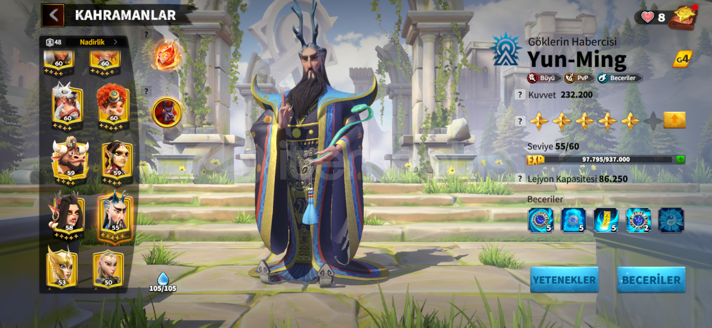 vip 15büyücü komutanlar (7 uyanık , 3 tane uyanmaya yakın )liliya: 5 5 5 5 1velyn: 5 5 5 5 1berthard:5 5 5 5 1thundelyn : 5 5 5 5 1thaleia :5 5 5 1theia : 5 5 5 5 1Tohar : 5 5 5 5 1Mu Husiang: 5 5 5 5 1Yun Ming: 5 5 5 2gramora: 5 5 3 1Garwood : 5 5 5 5 1Goresh: 5 5 5 5 1kuma : 5 5 5 5 1Skogul : 5 5 5 3Zayda : 5 5 5 5 1maggrat: 5 5 5 5 140 adet göç kâğıdı vardır