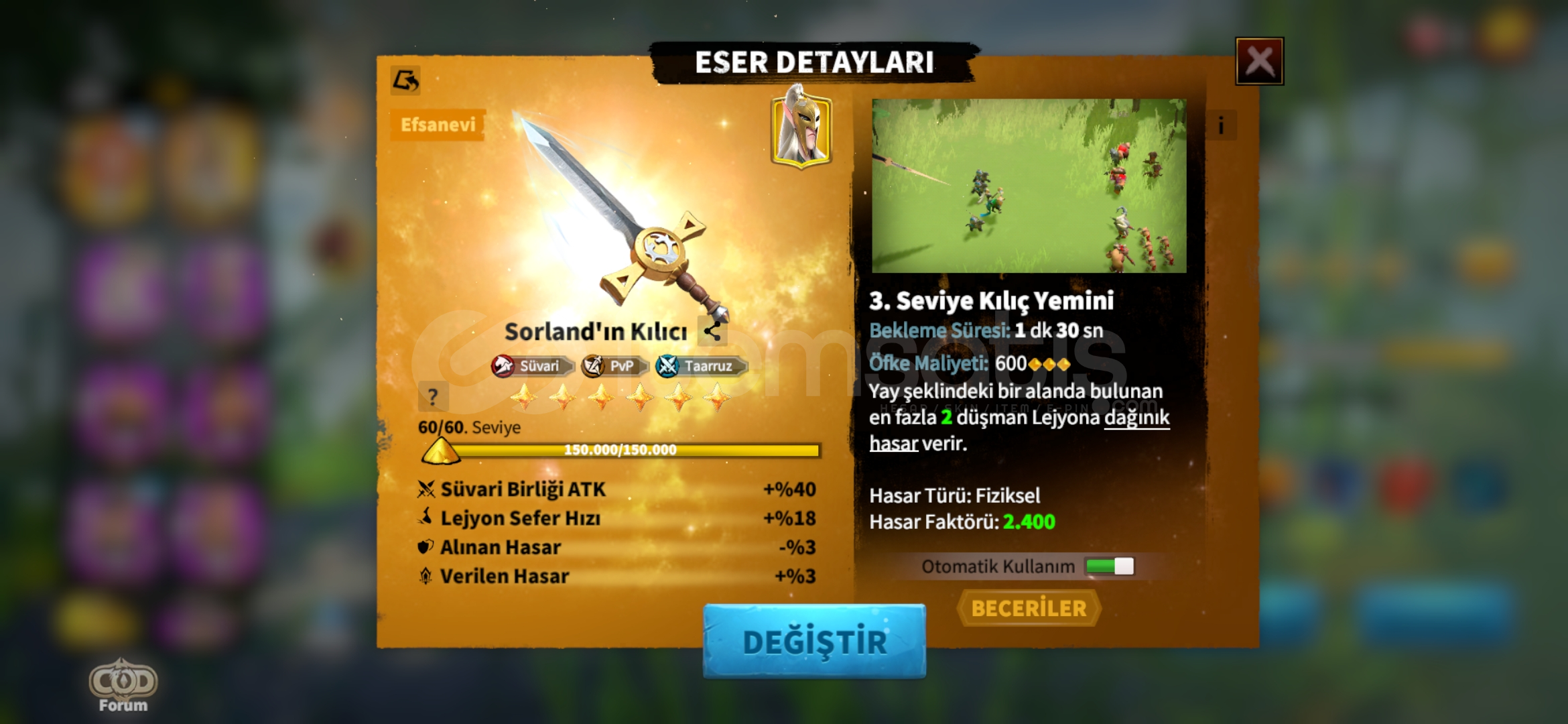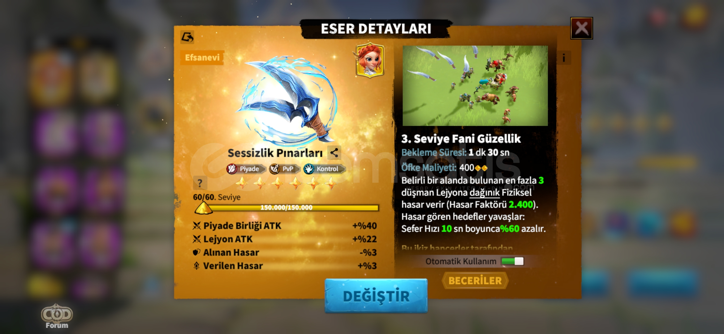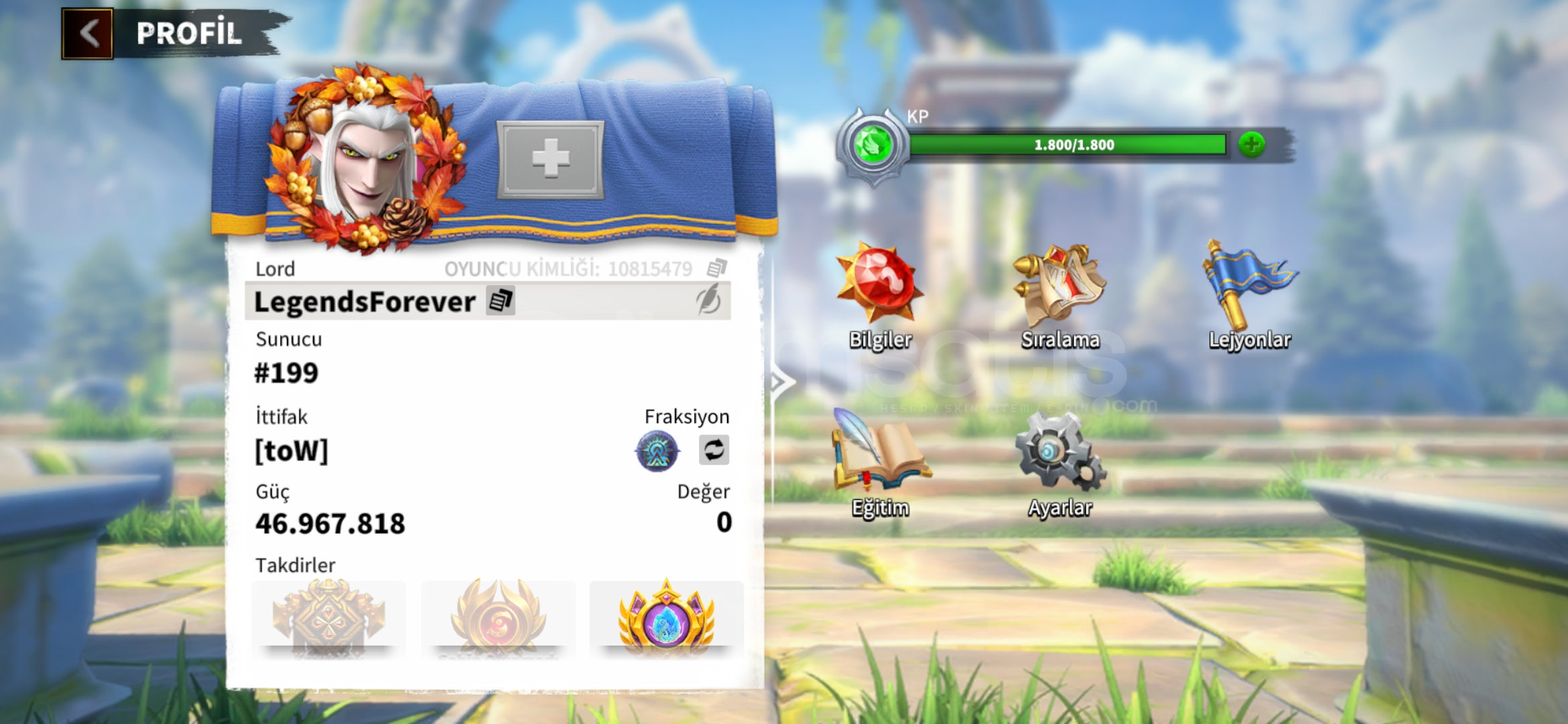 Karakterim bayağı iyidir 47m güce sahip savaşçılarımın %90ı yüksek seviyede Efsanevi Silahları...