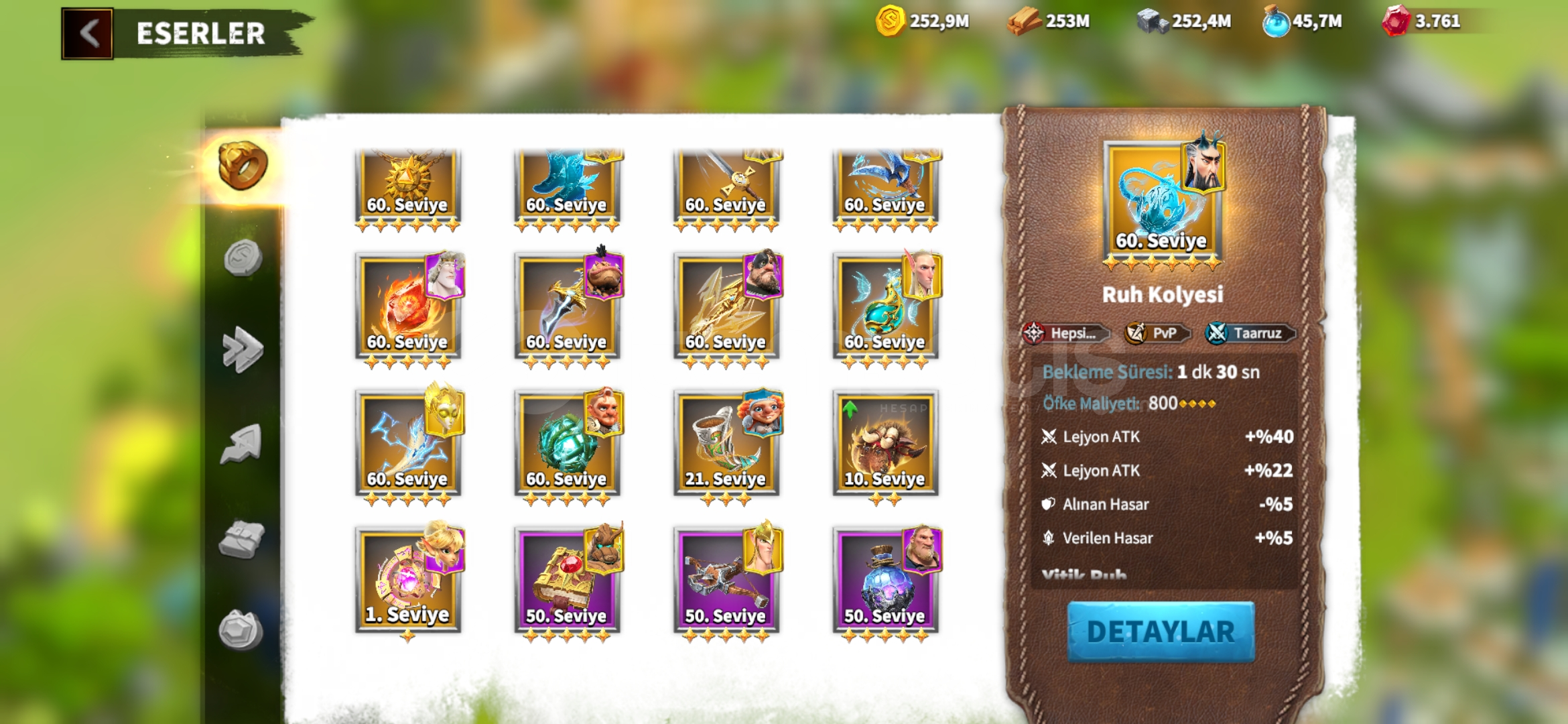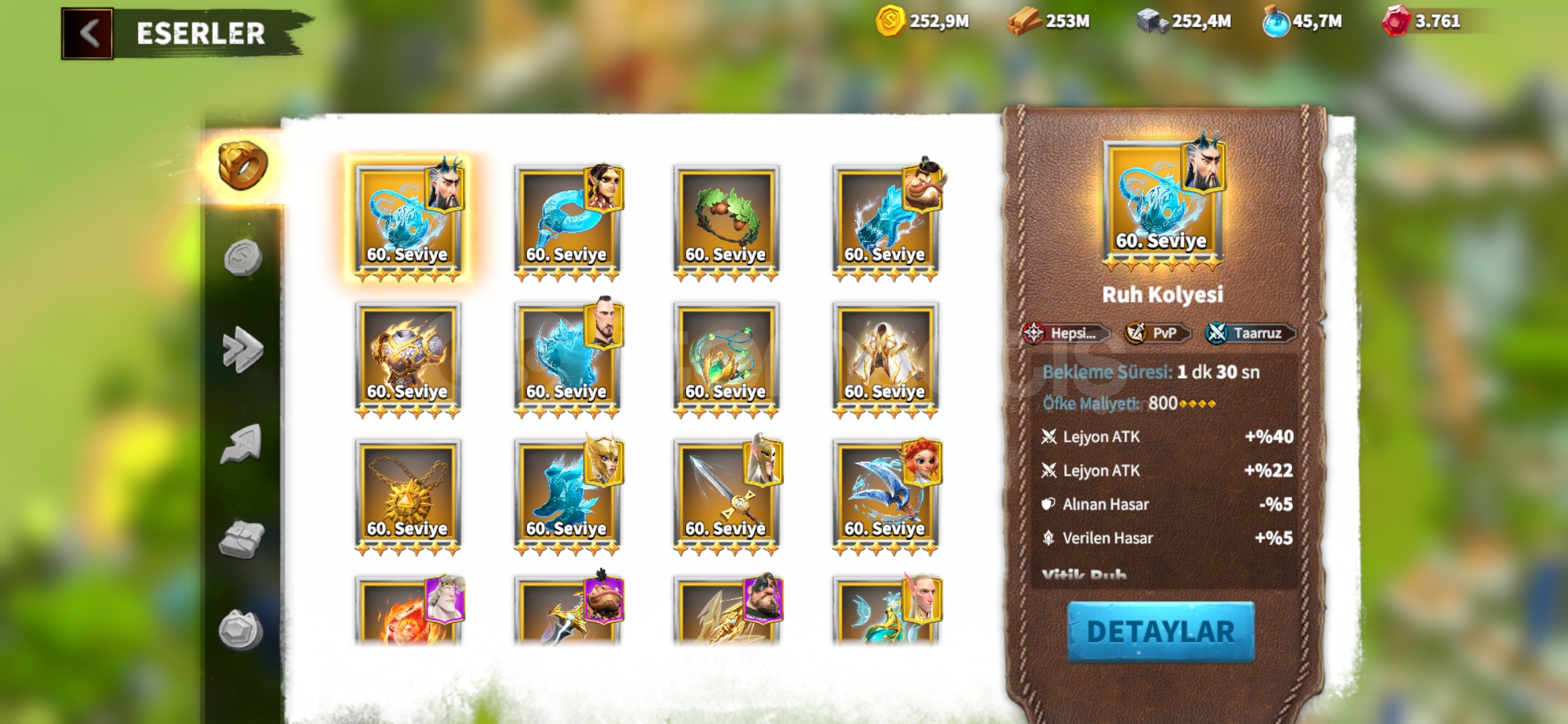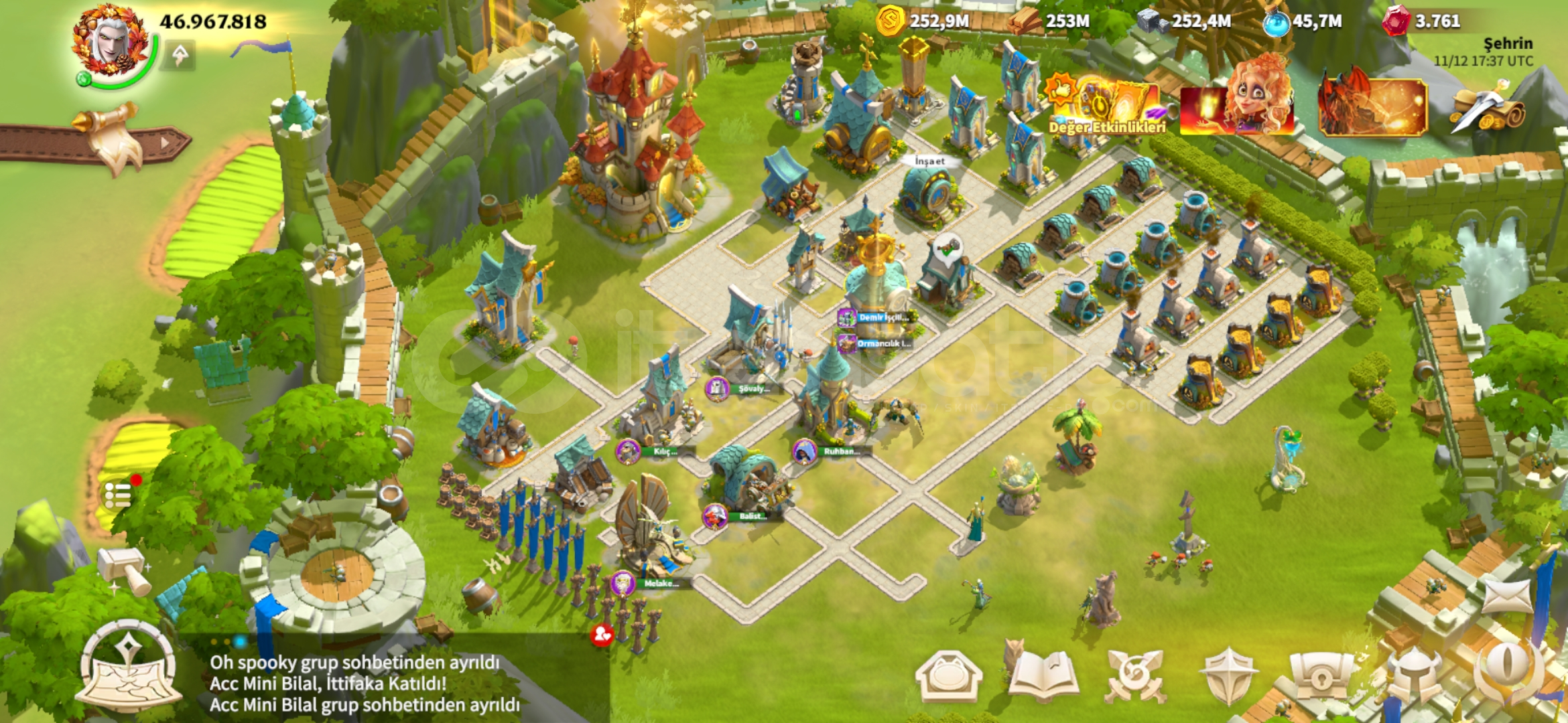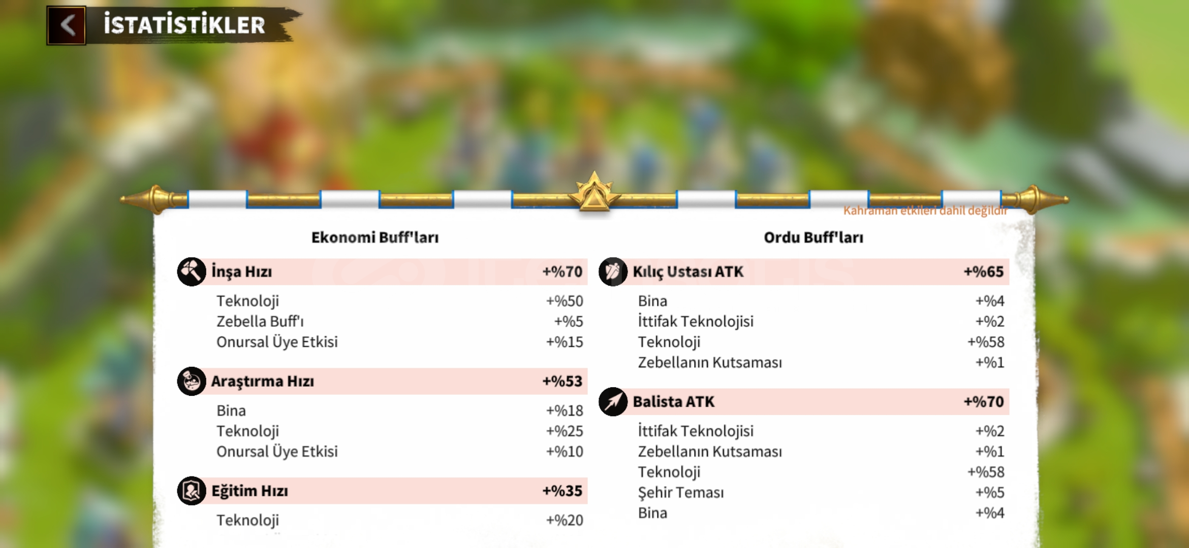 Karakterim bayağı iyidir 47m güce sahip savaşçılarımın %90ı yüksek seviyede Efsanevi Silahlarım mevcuttur ve çoğunun yıldızları fulldür. G2 G3 G4 karakterlerim dizilidir şehrimin geneli 24 25 seviyedir çok güzel bir şekilde dizilidir.