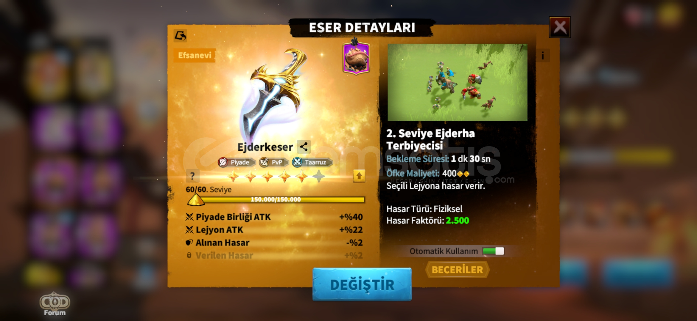 Call of Dragons kategorisinde Random Hesap ilanı oluşturmak yasaktır. Tespiti halinde ilanınız kapatılır ve 2. tekrarda hesabınız tamamen kapatılır.