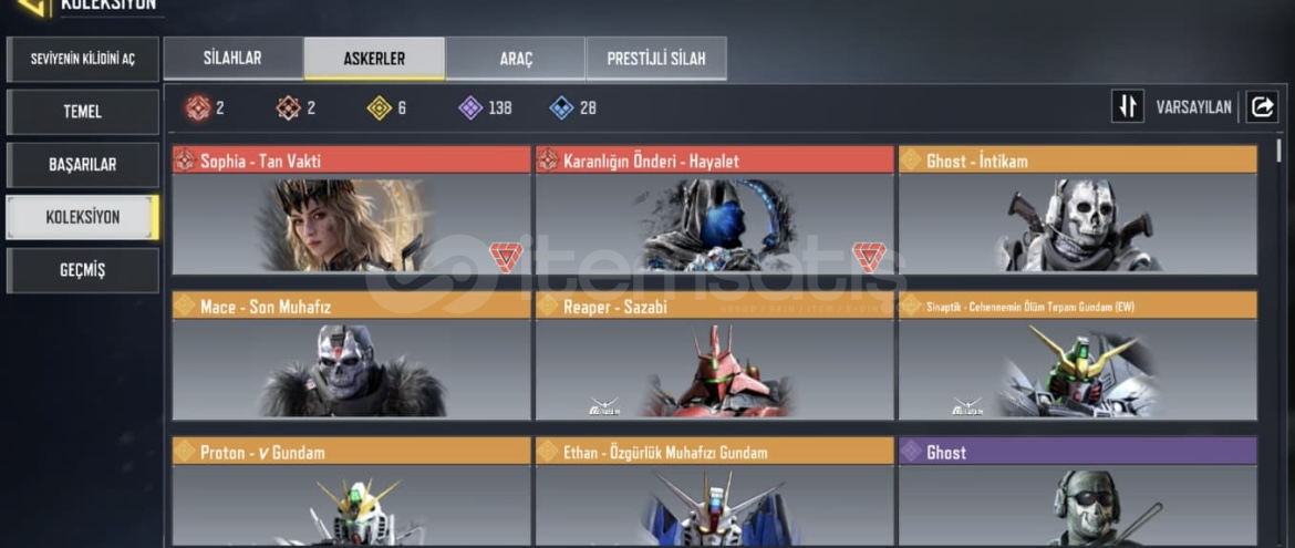 Hesapta toplam 💥8 Mitik Silah 7’si Full💥⚠️2 Mitik Karakter Full Ve 6 Efsanevi Karakter ⚠️🔫35 Efsanevi Silah + 5 prestij + 4 Efsanevi kılıç ⚔️ 🎮Bağlar Activision (Facebook +Apple Ölü )📞Çok uyguna bırakıyorum sormak istediğiniz bir soru olursa yazın