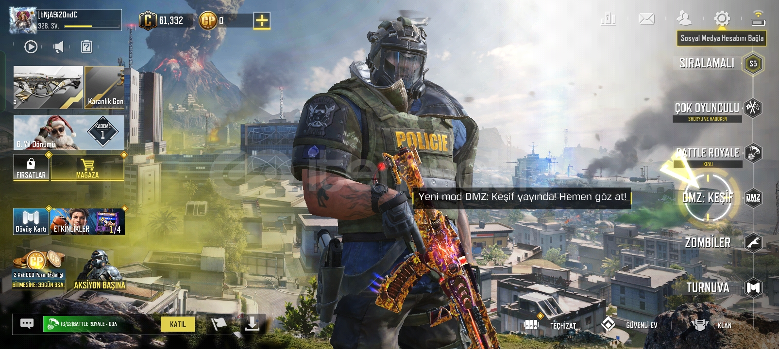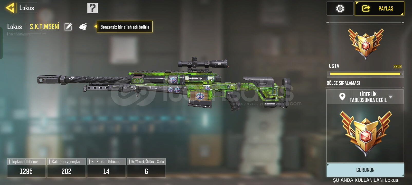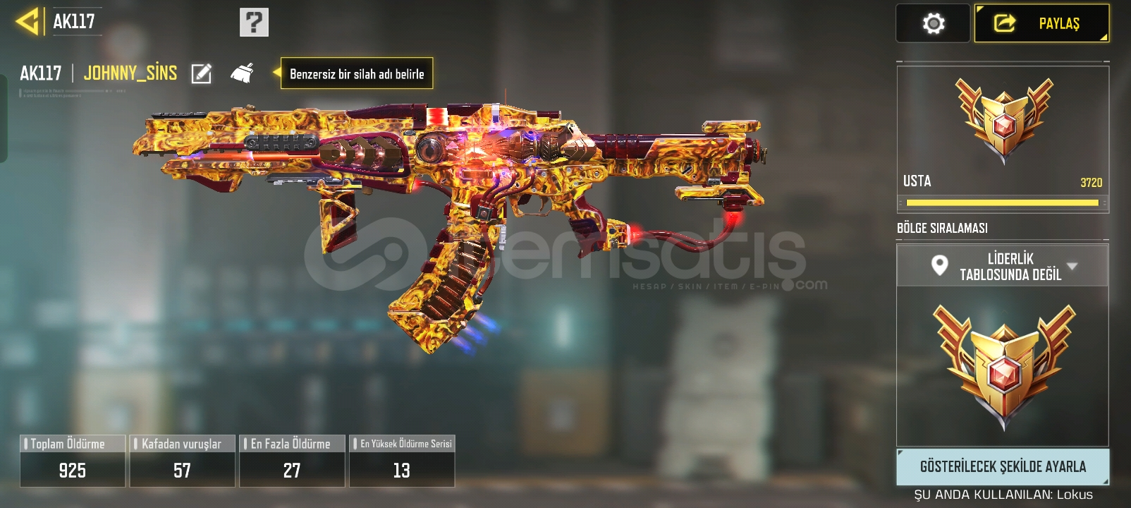 1 adet mitik silah, 9 adet efsanevi silah327 seviye, şuan Efsanevi rütbe , önceki sezonlarda 6 kere efsanevi liderlik tablosuna girdi191 mitik parçacık, 90 büyük efsanevi parçacık, 246 küçük efsanevi parçacıkAK 117 lava remix mitik silahta silah ustalığı ve özel silah adı varLokus silahında silah ustalığı ve özel silah adı var2 yıllık hesap61,000C kredi v...