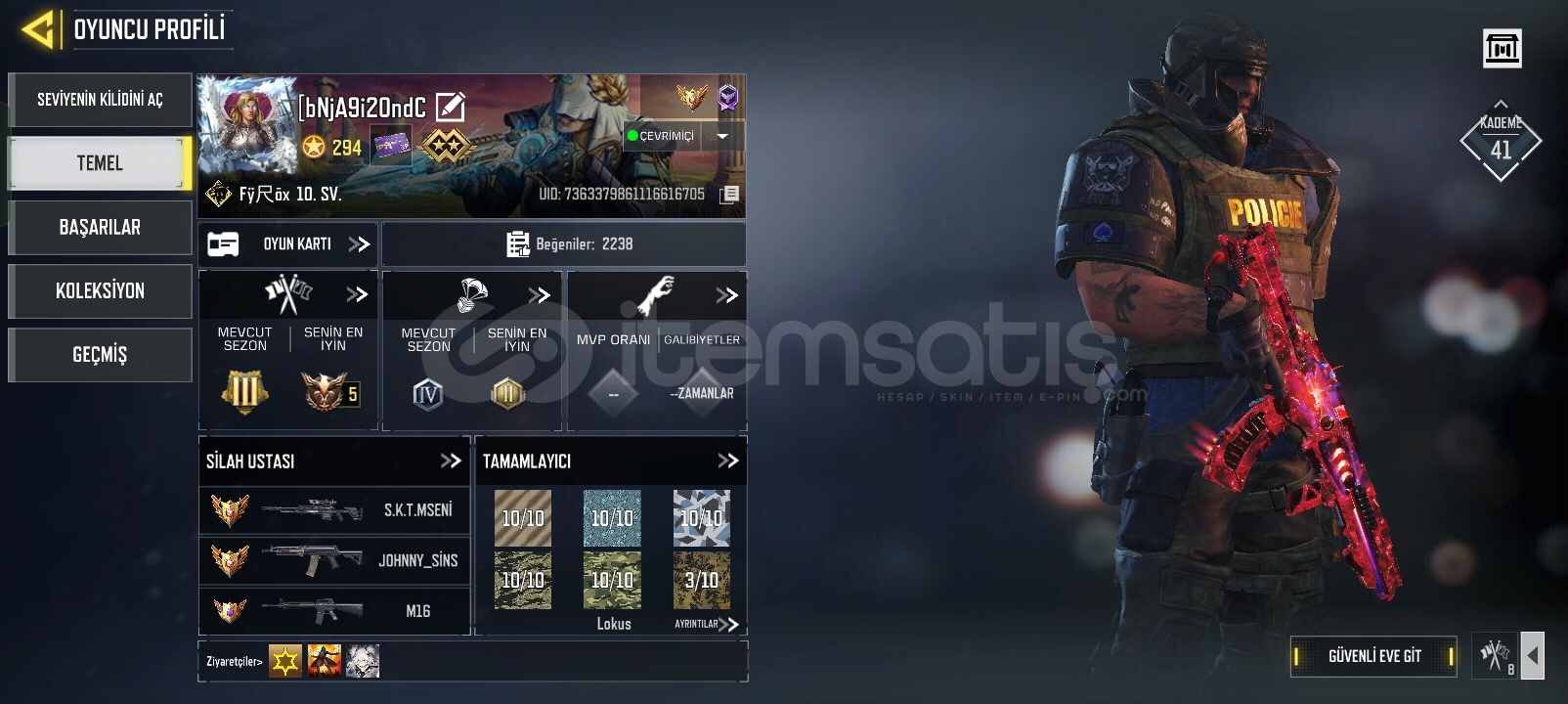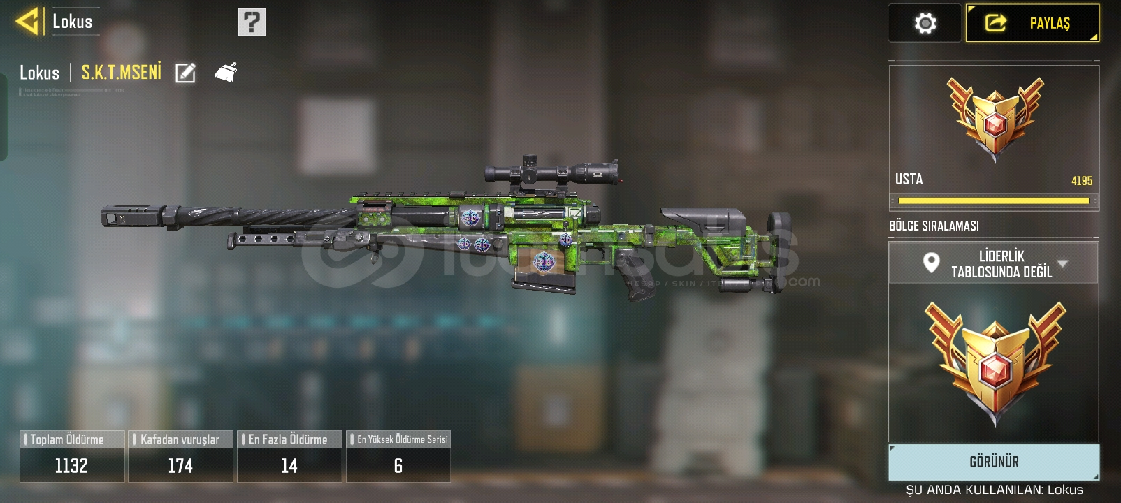 1 adet mitik silah, 7 adet efsanevi silah, 295 seviye, şuan büyük usta 3 , önceki sezonlarda 4 kere liderlik tablosuna girdi, 100 ...