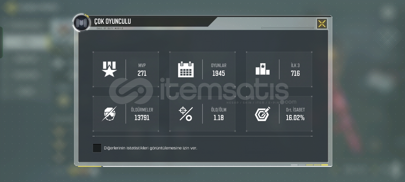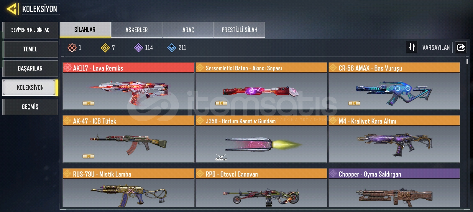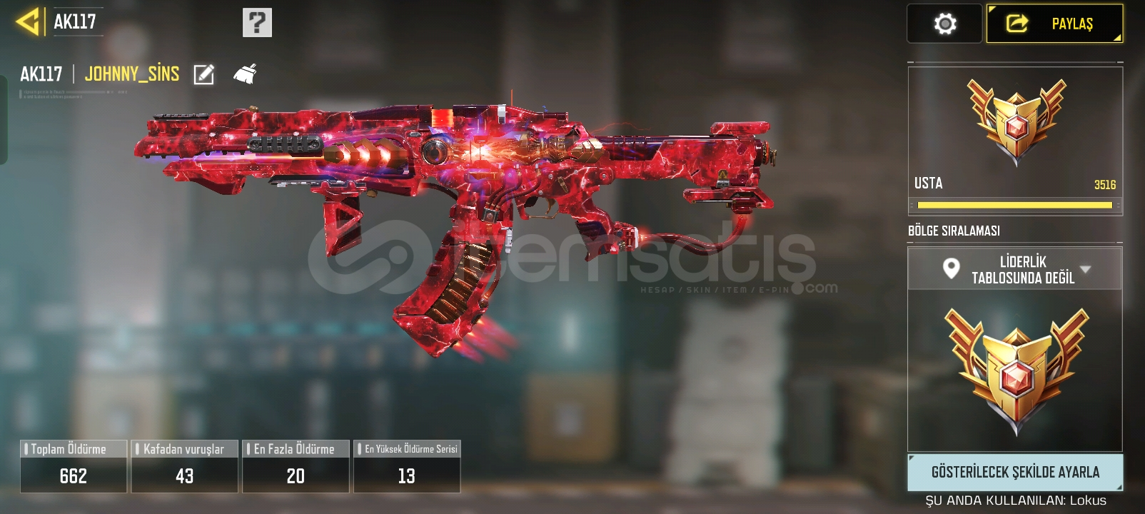 1 adet mitik silah, 7 adet efsanevi silah, 295 seviye, şuan büyük usta 3 , önceki sezonlarda 4 kere liderlik tablosuna girdi, 100 mitik parçacık, AK 117 lava remix mitik silahta silah ustalığı ve özel silah adı var, lokus silahında silah ustalığı ve özel silah adı var 2 yıllık hesap, 60 C kredi varPAZARLIK SÜNNETTİR