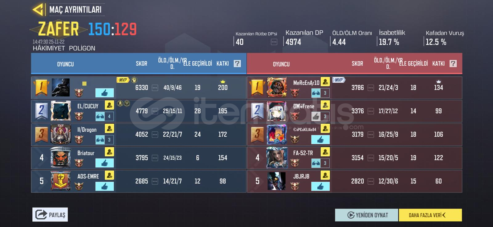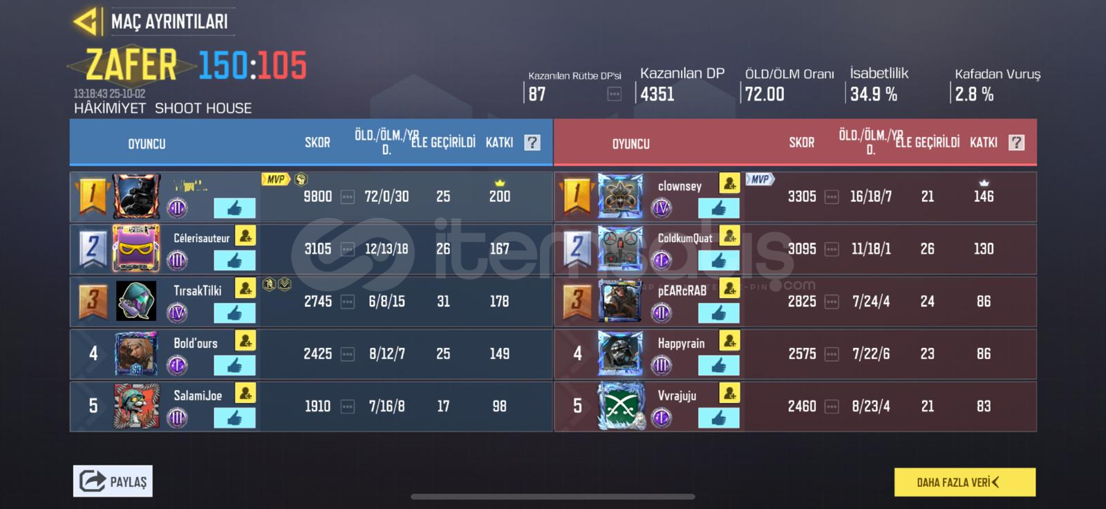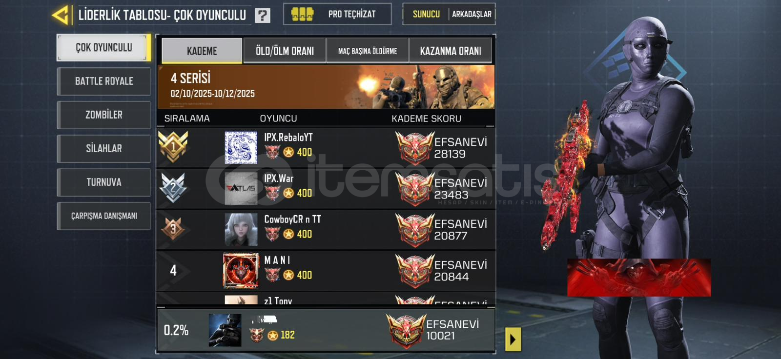 Merhaba, Call of Duty mobile oyunu için boost yapıyorum. Fotolarda gördüğünüz üzere kendime ait 1-2 oyun fotosunu ve Oyunun en iyi oyuncularının bulunduğu ve benim de o klanın parçası olduğum IPX klan üyesiyim. Vaktim sınırlı ve kendi hesabımı da kastığım için maalesef sizi ranked(SIRALAMA) top 5000 sıralamasına sokamam ama isterseniz hesabınızı rankı ne olursa olsun, en düşük ranktan bile nereye isterseniz maximum Legendary(EFSANEVİ) 10000 puana kadar güvenli ve çok hızlı bir şekilde yükseltebilirim. Yıldırım hızı teslimat ve kaliteli hizmetten yararlanmak için çekinmeden mesaj atabilirsiniz. Eğer isterseniz bazı ranklar için duo boost bile yapabilirim.