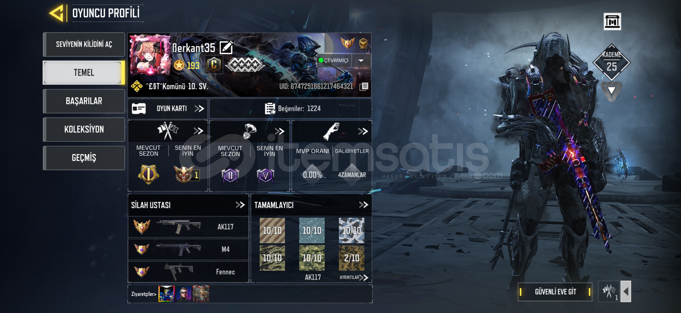 193 level emeklik hesabım satılıktır toplamda 17-20bin tl yatırılmıştır içindeki skinler belli pazarlık konuşulur