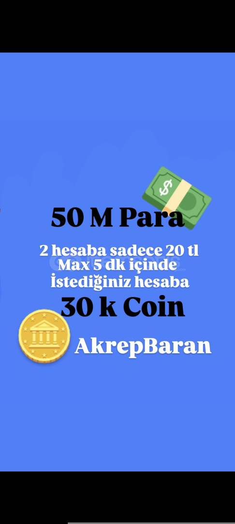Yanlış görmediğiniz 1 hesap değil 2 hesap sadece 20 TL istediğiniz 2 hesaba 30 k coin ve 50 m para sadece 20 TL 1 hesap değil 2 hesap bildirim düşer düşmez iletişime geçerim ve Max 5 dk içinde işlemi hallederim ister kendi hesabınıza ister bizim olusturudugumuz hesaba