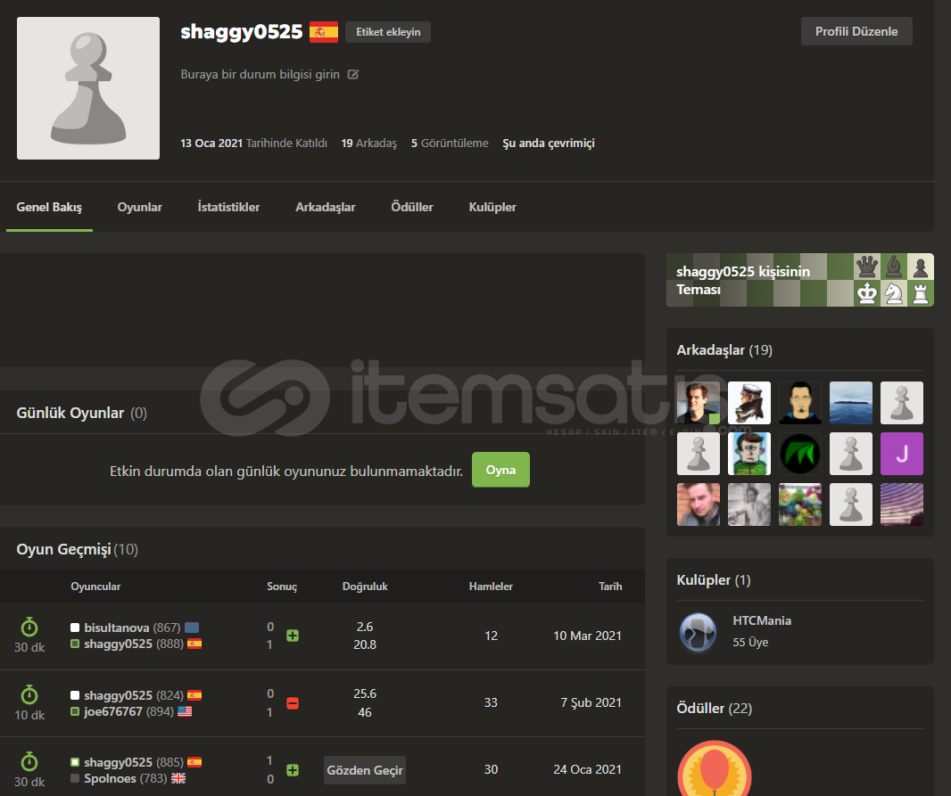 CHESSCOM 2021 YILI KURULUM TEMİZ HESAP 10 TANE OYUNU VAR HIZLI 888 PUAN