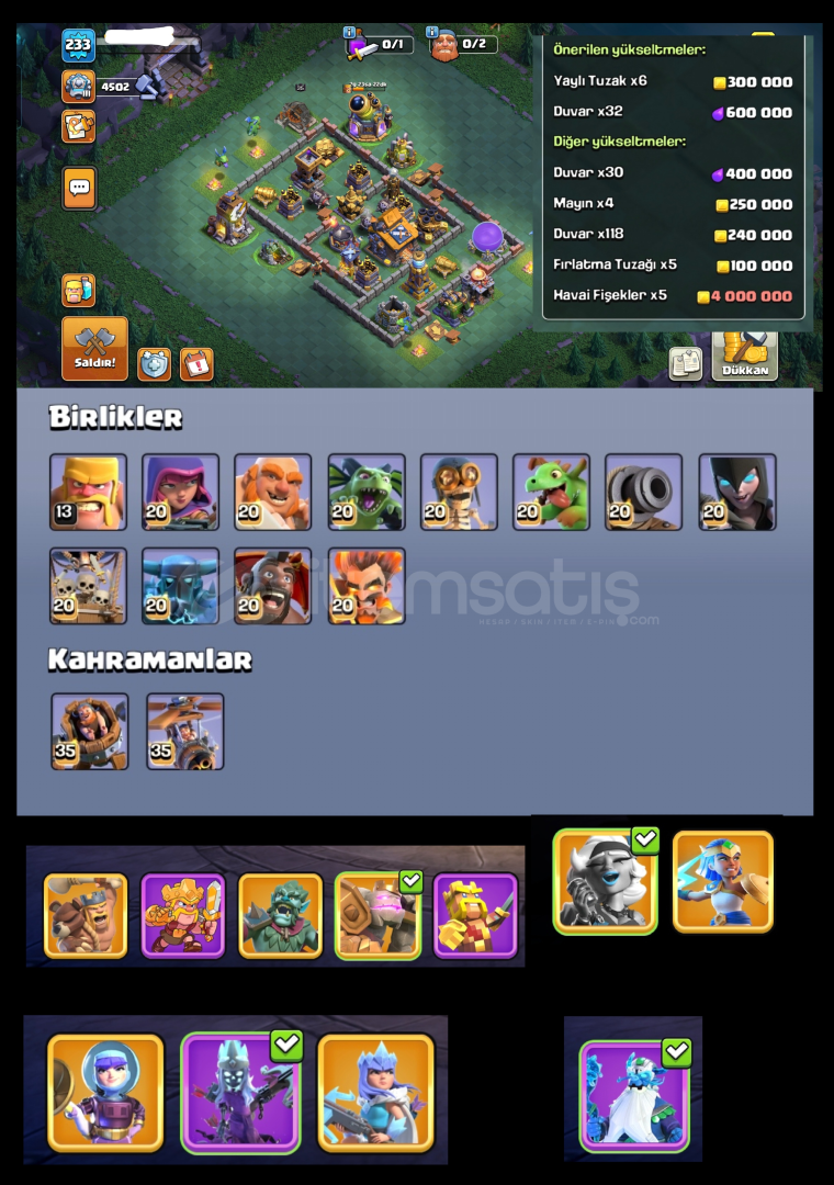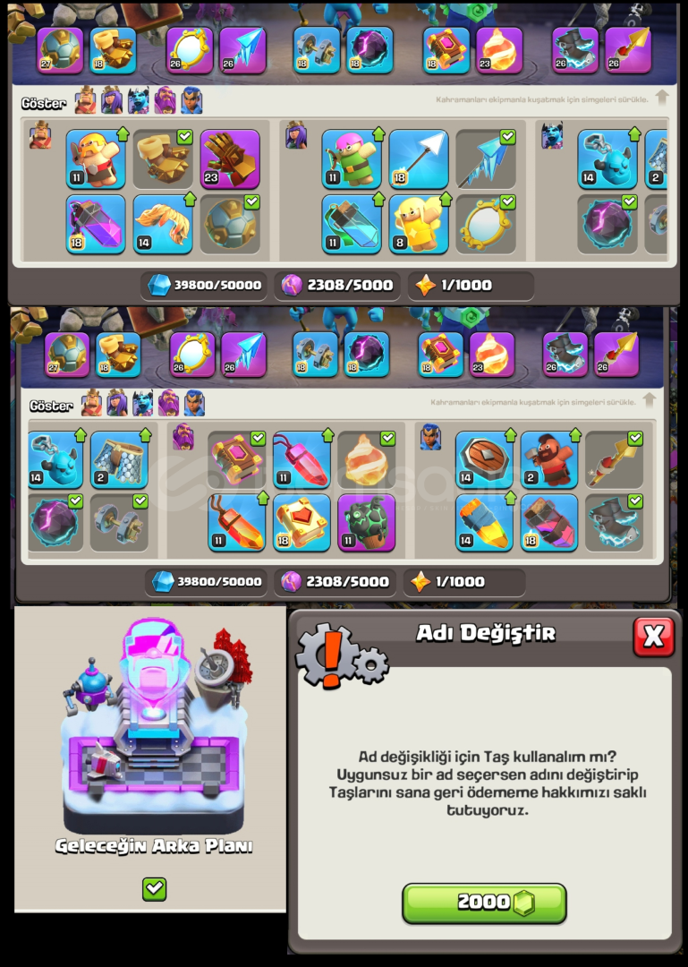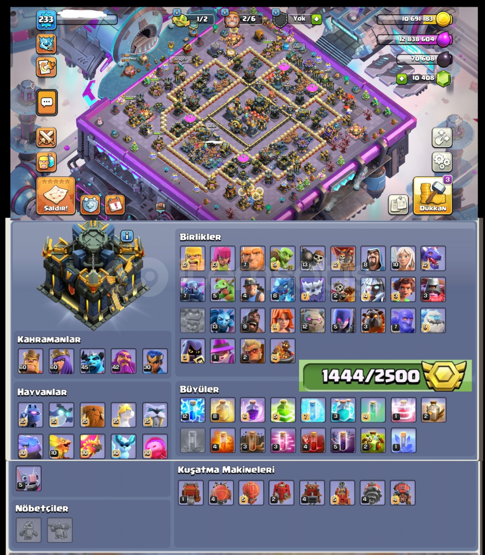 LÜTFEN AÇIKLAMAYI SONUNA KADAR OKUYUNUZ!- HESAPTA BASILACAK SADECE DUVAR VE TUZAKLAR KALMIŞTIR. BÜTÜN SÜPERŞARJLAR BİTMİŞTİR!! - 10.400 YEŞİL TAŞ MEVCUTTUR!!-1444 TANE LİG MADALYASI MEVCUTTUR!! - Demircinin durumu çok iyidir.- 11 Tane Kahraman Kostümü ve 1 tane ücretli arka plan mevcuttur. - GELECEĞİN ARKA PLANI - fotoğrafta mevcuttur.- Yan Köy Maxa Yakındır. Birka&cce...