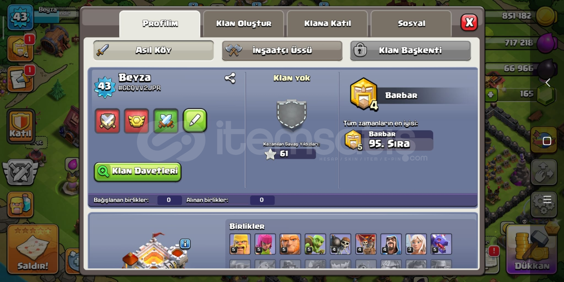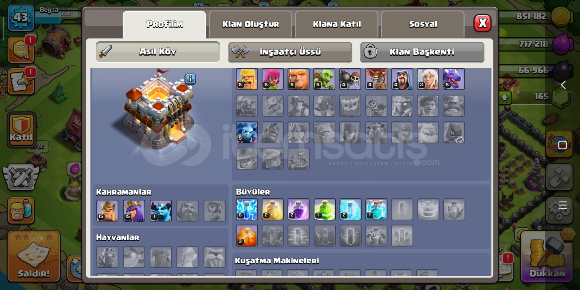 *43 Level*4 İnşaatçı*165 Yeşil Taş*Otomatik Teslimat*Detaylar Resimlerdedir.*1 adet ücretsiz isim değiştirme hakkı vardır.*Supercell Bağlı değildir. Kendi hesabınızı bağlayabilirsiniz.