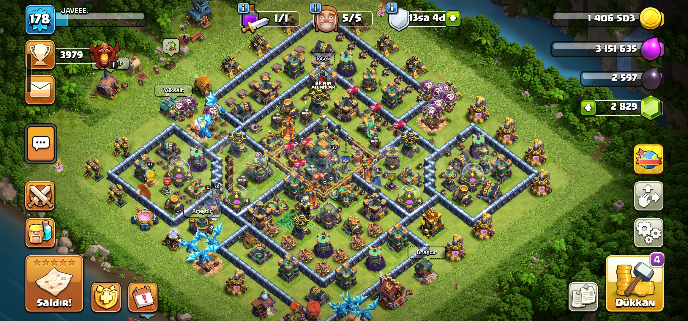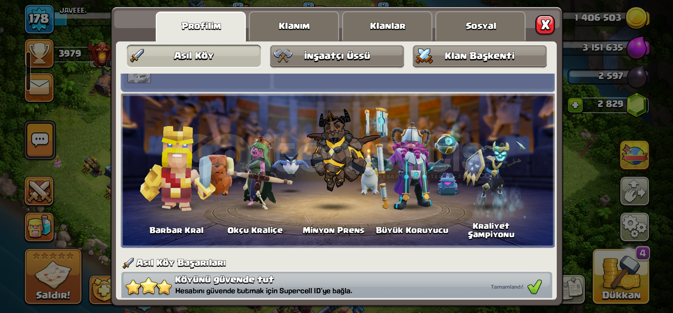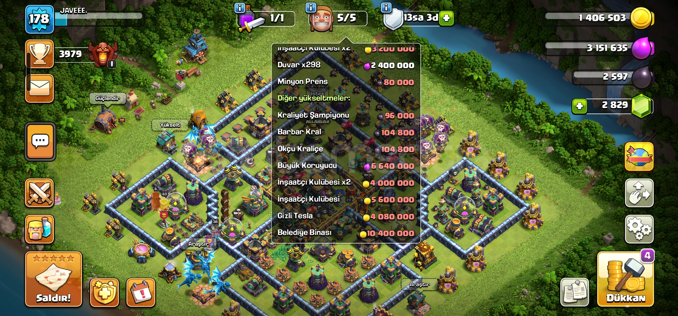 Belediye binası 14. Seviyedir full olmasına sadece duvarlar ve ufak tefek savunmalar kalmıştır.Hesapta 2800 küsür taş bulunuyor.Bütün herolarda kostüm vardır.
