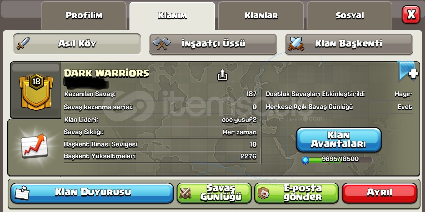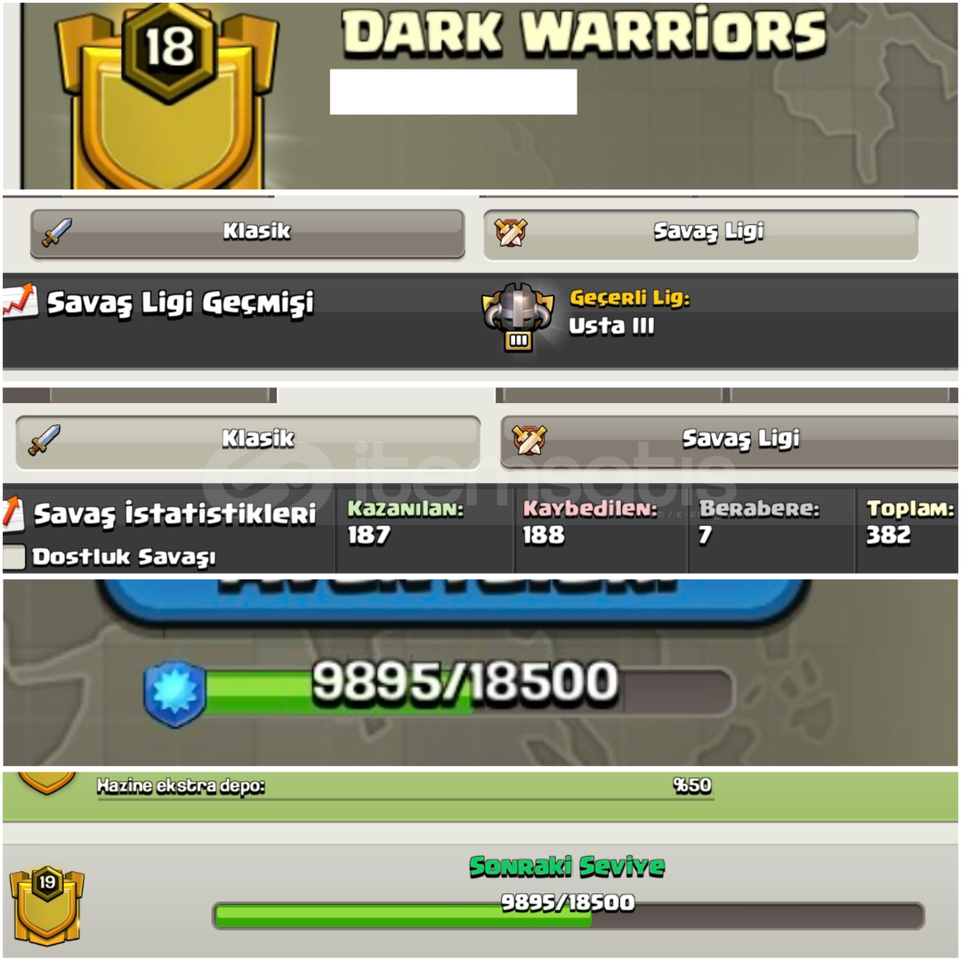 evel DARK WARRİORSANLAMI KARANLIK ŞAVAŞÇILARUSTA 3 LİG KLANBAŞKENT FULLLL 10 SEVİYE19 AZ VAR GÜNLÜĞÜ İYİ SERİSİ MEVCUTMÜKEMMEL ÖTESİ KLANALINDIĞI GİBİ TESLİMAT SAĞLANIRALAN KİŞİYE ŞİMDİDEN HAYIRLI OLSUNHERKESE İYİ SATIŞLAR BOL KAZANÇLAR