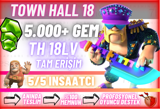🎮 CLASH OF CLANSTOWN HALL 18 + 5000 ELMAS / 5 İNŞAATÇI HESAPLAR