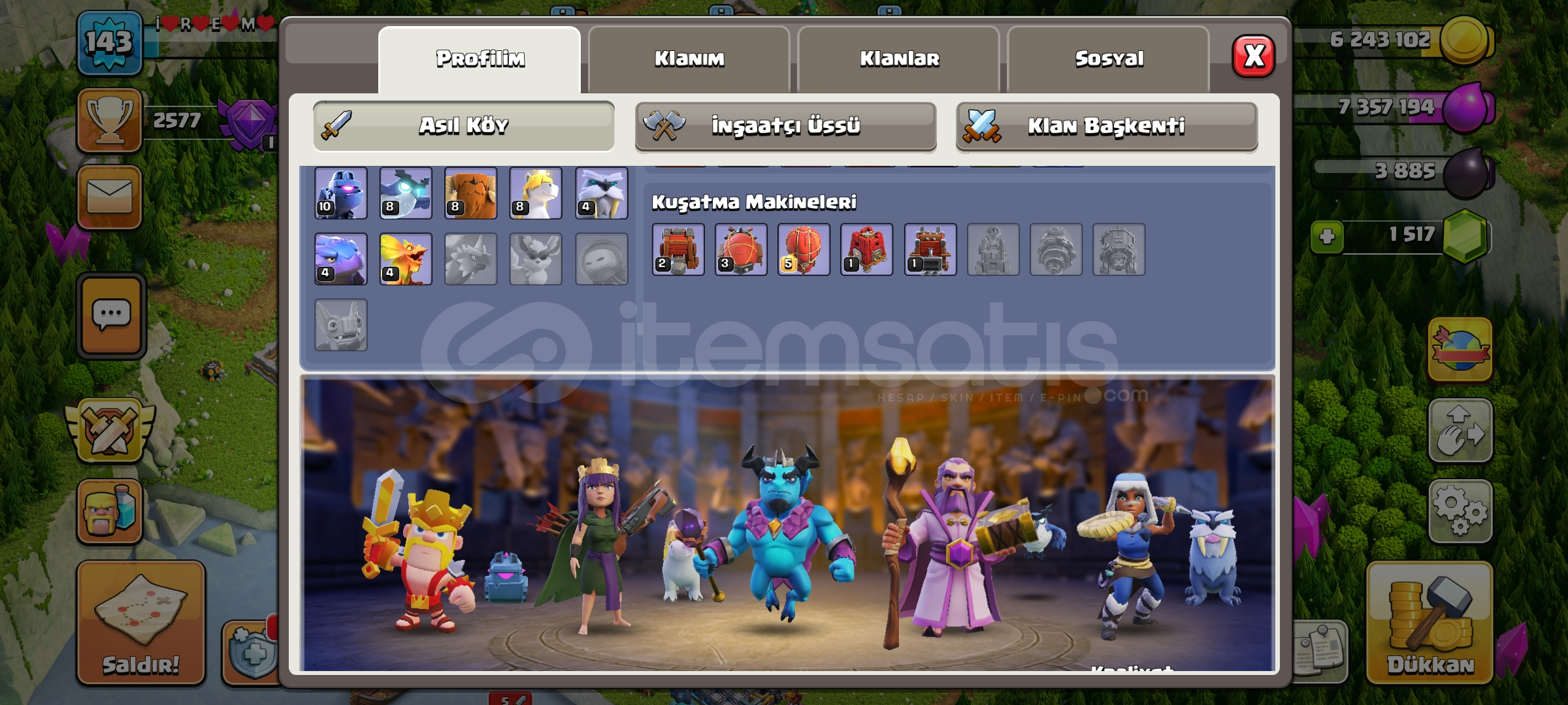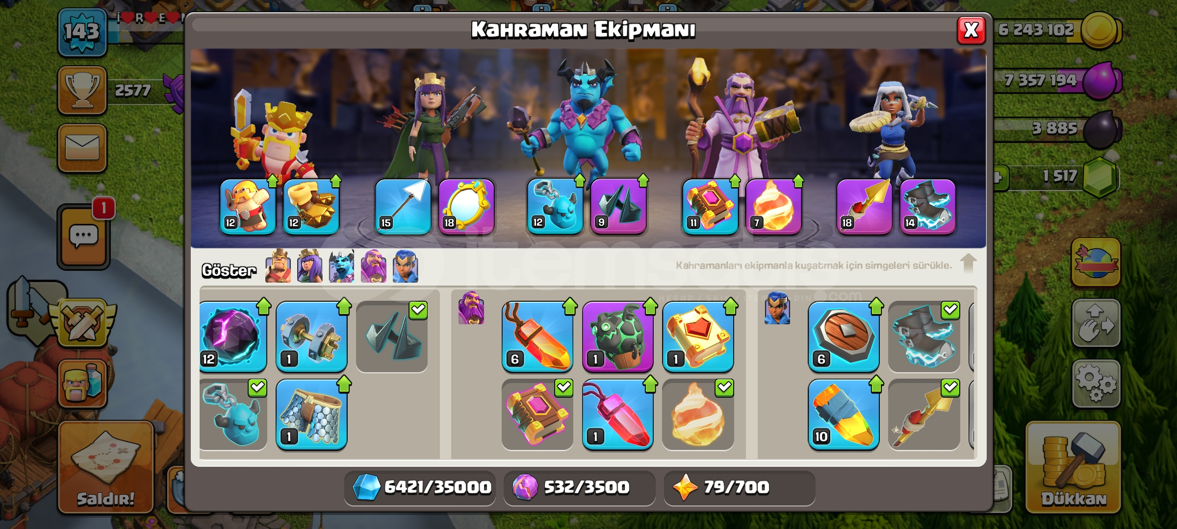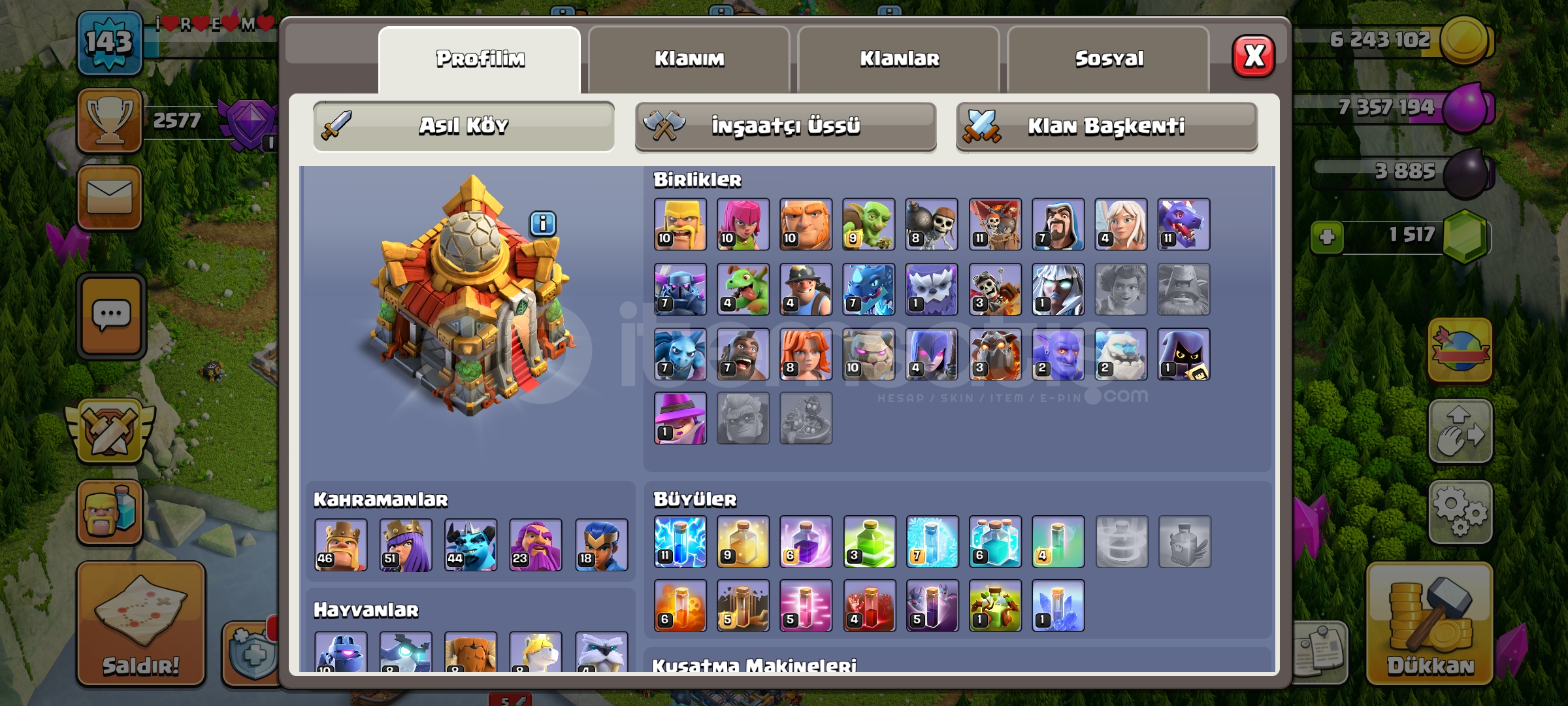 Hesap %20 indirim ile 1000₺'den 800₺'ye İndirilmiştir 1 Haftalık .Belediye Binası 16, 143 Seviye HesapKöy Kodu: #P0LQL8QPU.1.500 Taş Vardır120 Lig Madalyası Vardırİnşaatçı Kitabı; Altın, İksir ve Kara İksir Rünleri Vardır.Ağır Savunmalardan: Monolit,Kartal Topu, X-yayları, Cehennem Kuleleri, Kayasaçarlar, Toplar ve Hava Saçarlar Full+.Toplayıcı, Made...