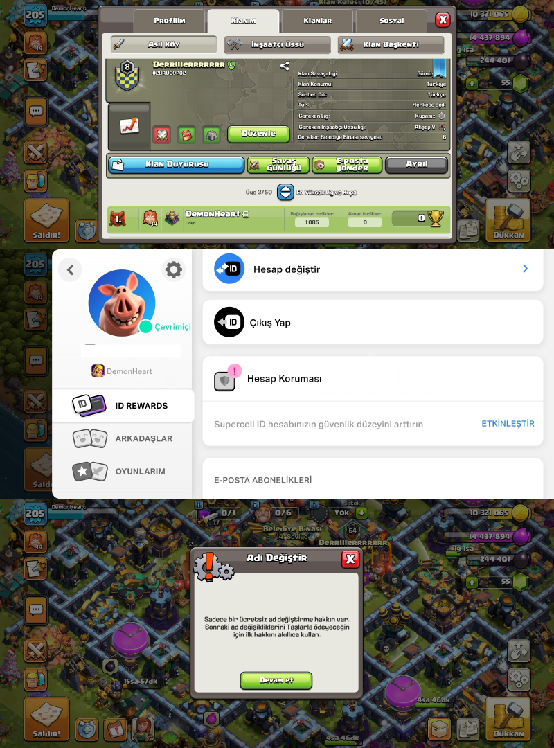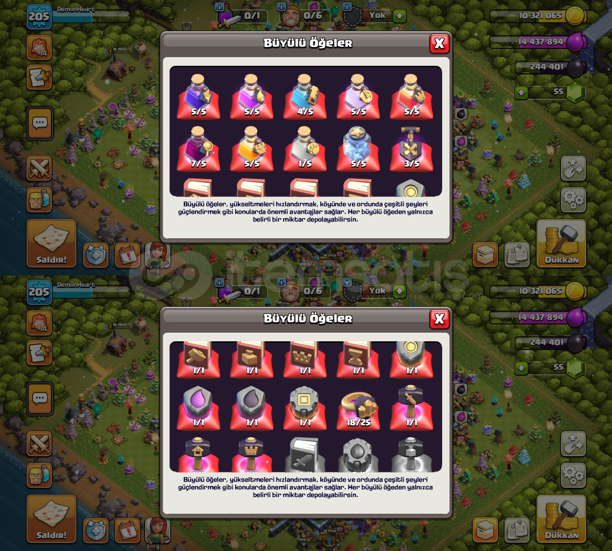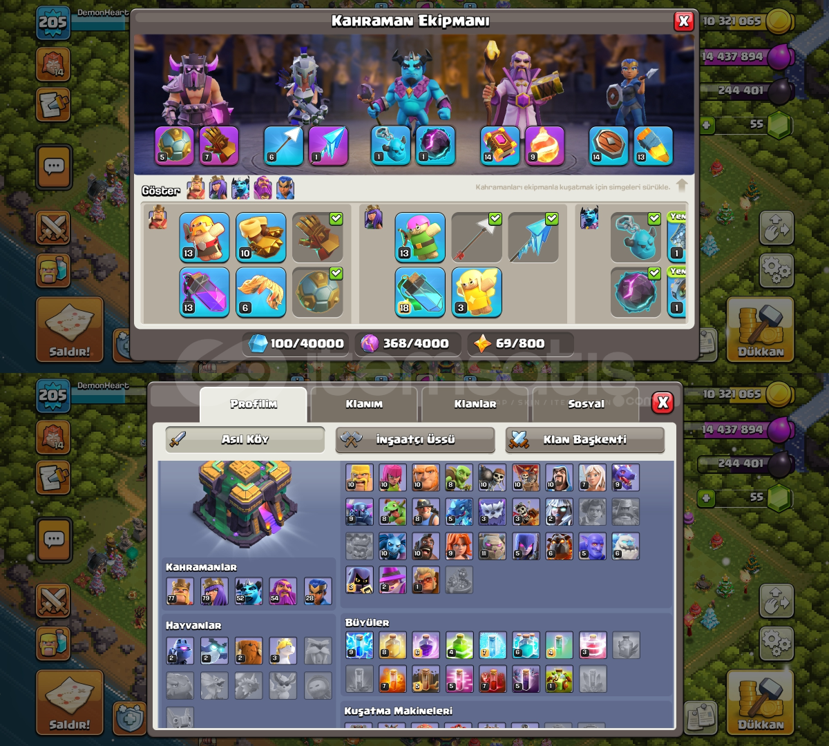 205 LEVEL, 4 DESTANSI EKİPMAN. MUHTEŞEM HERO SEVİYELERİ.150 ADETTEN FAZLA DEKOR VE 2018 DAHİL TÜM YILBAŞI AĞAÇLARI, YIL DÖNÜMÜ PASTALARI VARDIR, BAZILARI KÜREKLİDİR. FULL DOLU BÜYÜLÜ ÖĞELER. KOLEKSİYONLUK HESAP 8 SEVİYE KLAN HEDİYELİDİR. ÜCRETSİZ İSİM DEĞİŞTİRME VE YAN KÖY HERO SEVİYESİ SON 35 LEVELDİR. KORUMA Y...
