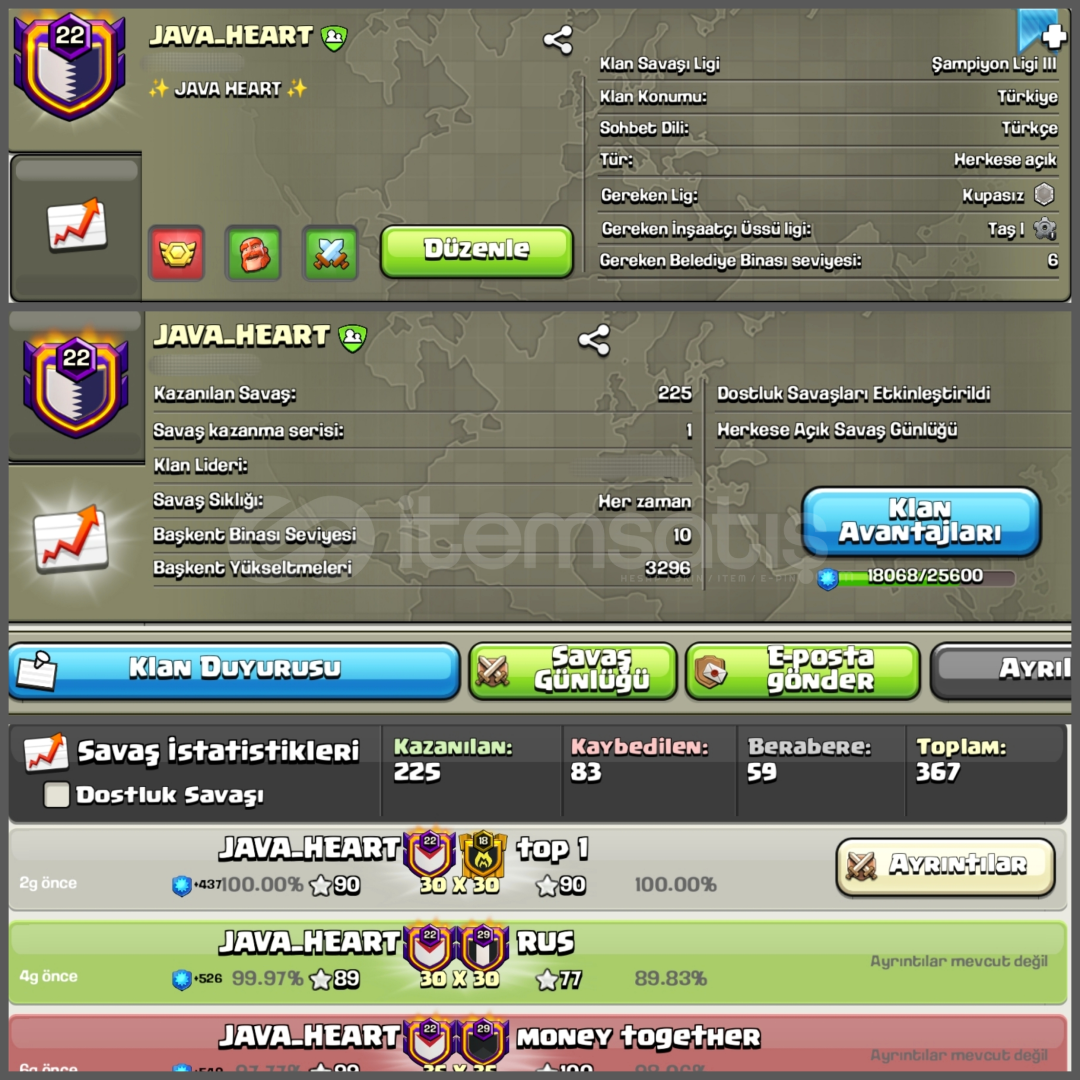 Şampiyon 3 ligBaşkent full olmasına 20-30 yükseltme kalmışİndirim cüzi olur.Her bütçeye uygun klan bulunmaktadır.Diğer ilanlarımızada göz atabilirsiniz