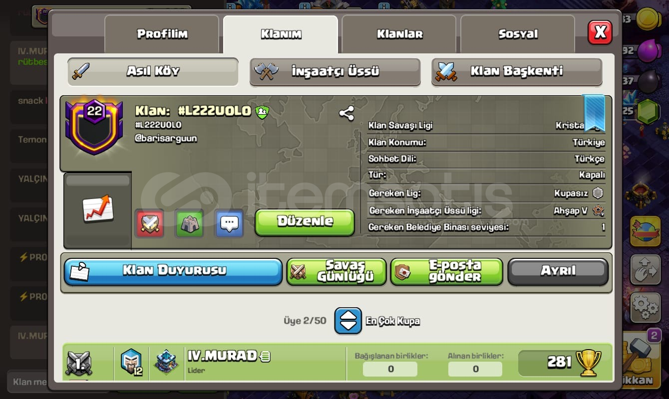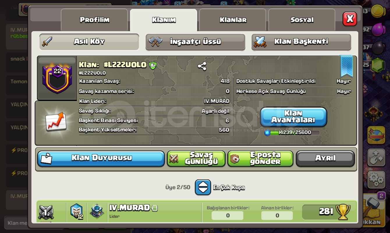 İsmi değişen klan 22 seviye kristal 1 lig başkent düşük ancak seviyesi yüksek