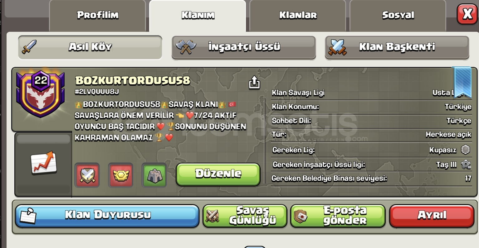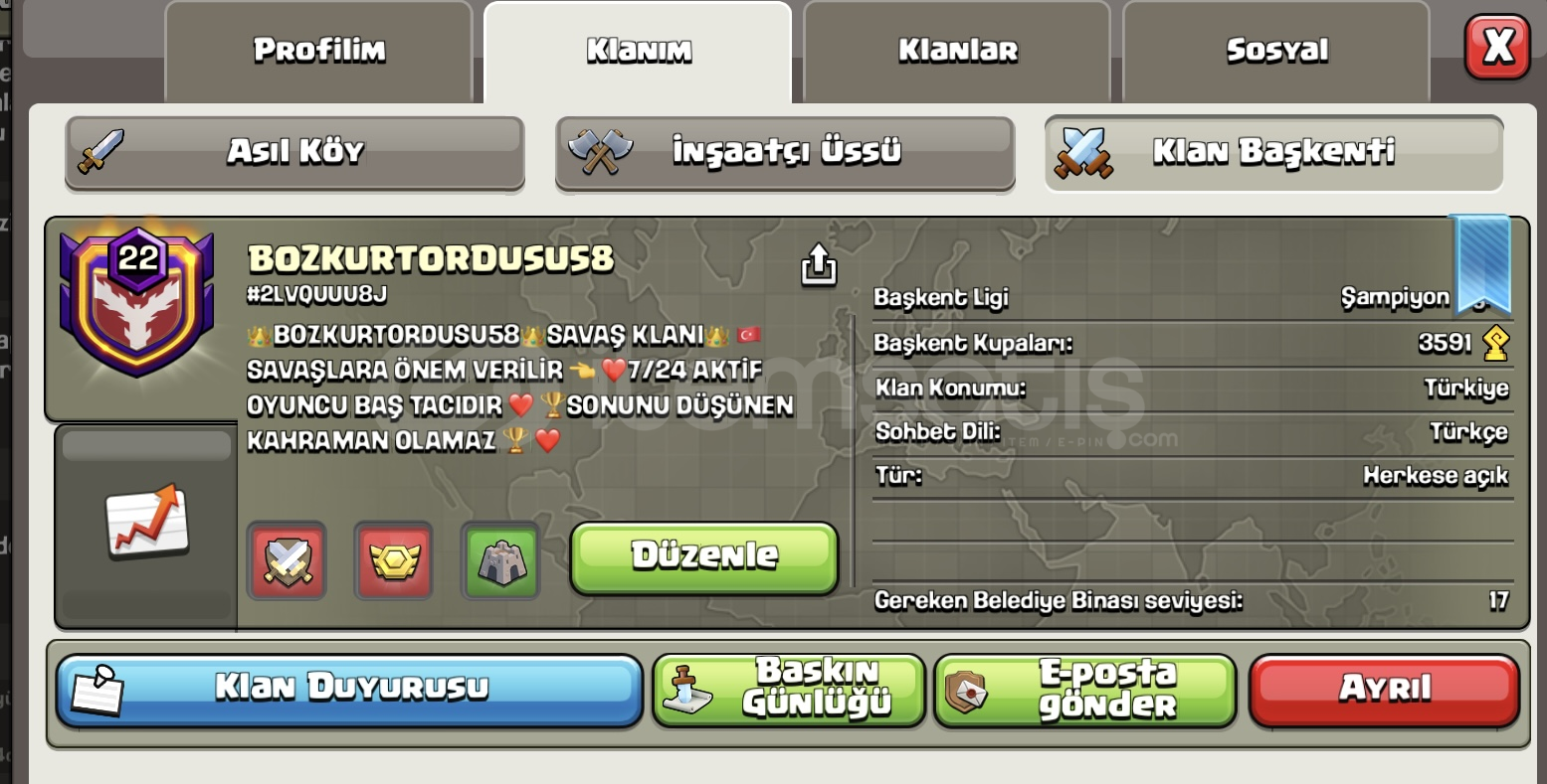 Yakında 23 level olacak sorunsuz klan ciddi alıcılar yazarsa sevinirim tüm görevler eksiksiz tamamlanıyor 33 üyesi ...