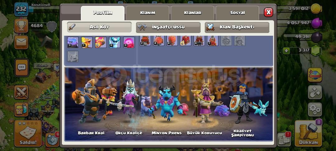 232 seviye sağlam hesap3 altın bilet kostümü 3 k taş İnşaatçı üssü max duvar hariç Ana hesapda çok bişey yok 2-3 ay altın bilet alıb iyi kasilirsa maxlanir.Yalnız elektro çizme 26 seviye geri kalan kullandığım ekipmanlar max .400+ lig madalyası ve bisuru kitap , büyülü öğelerde var .Çırak max 8 seviye .