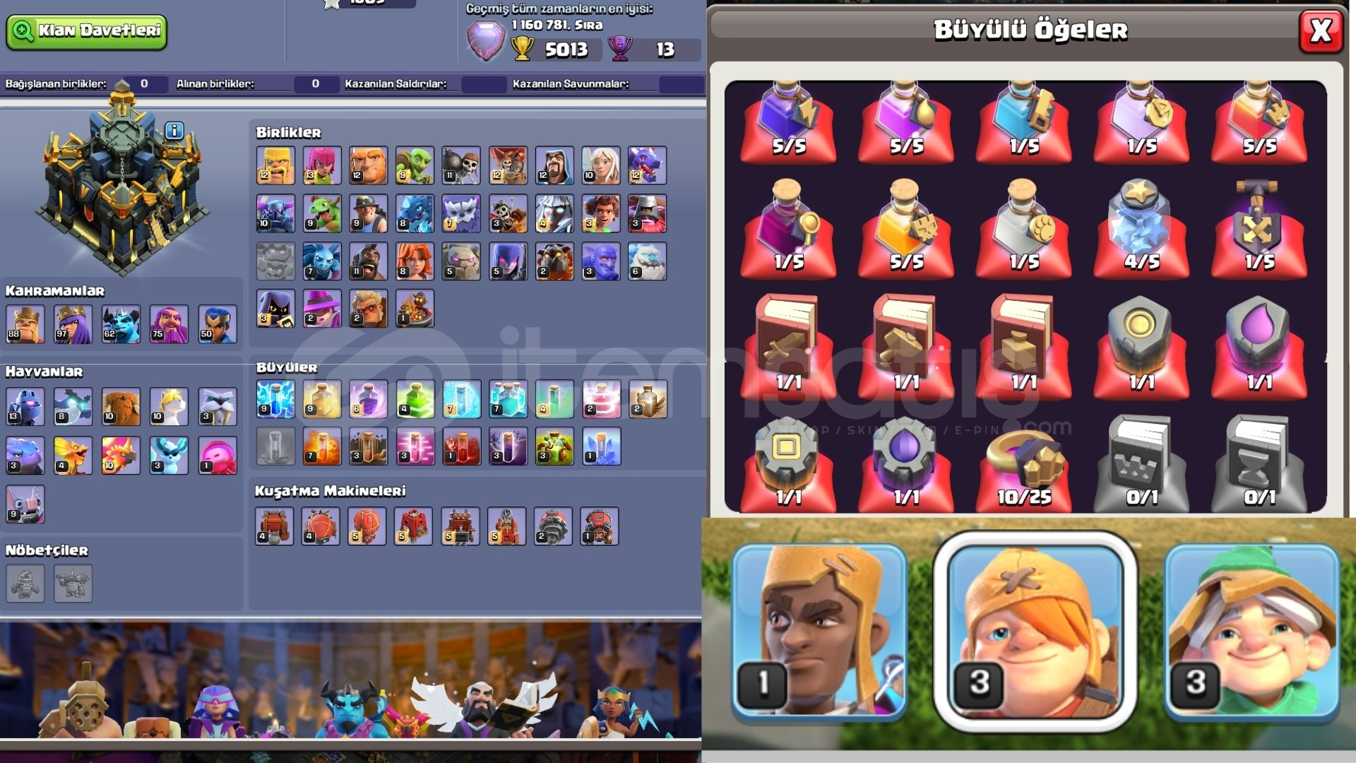 233 LEVELDİR , ALTIN BİLET AKTİF DURUMDADIR.YENİ EKİPMAN ALINMIŞ 14 SEVİYEDİR , EKİPMANLAR SAĞLAM DURUMDA ALEV TOPU MAX.BÜYÜLÜ ÖĞELER DOLU DOLUDUR, 7000 E YAKIN TAŞ.GÖLGE ARKA PLANI MEVCUT, ÇIRAKLAR ORTA SEVİYEDE.2 HERO MAX DİĞERLERİDE MAXA ÇOK YAKIN!3 Ü EFSANEVİ TOPLAM 11 SKİN VARDIR.İNŞAATÇI ÜSSÜ SAĞŞAM SEVİYEDE.TEL NO B...