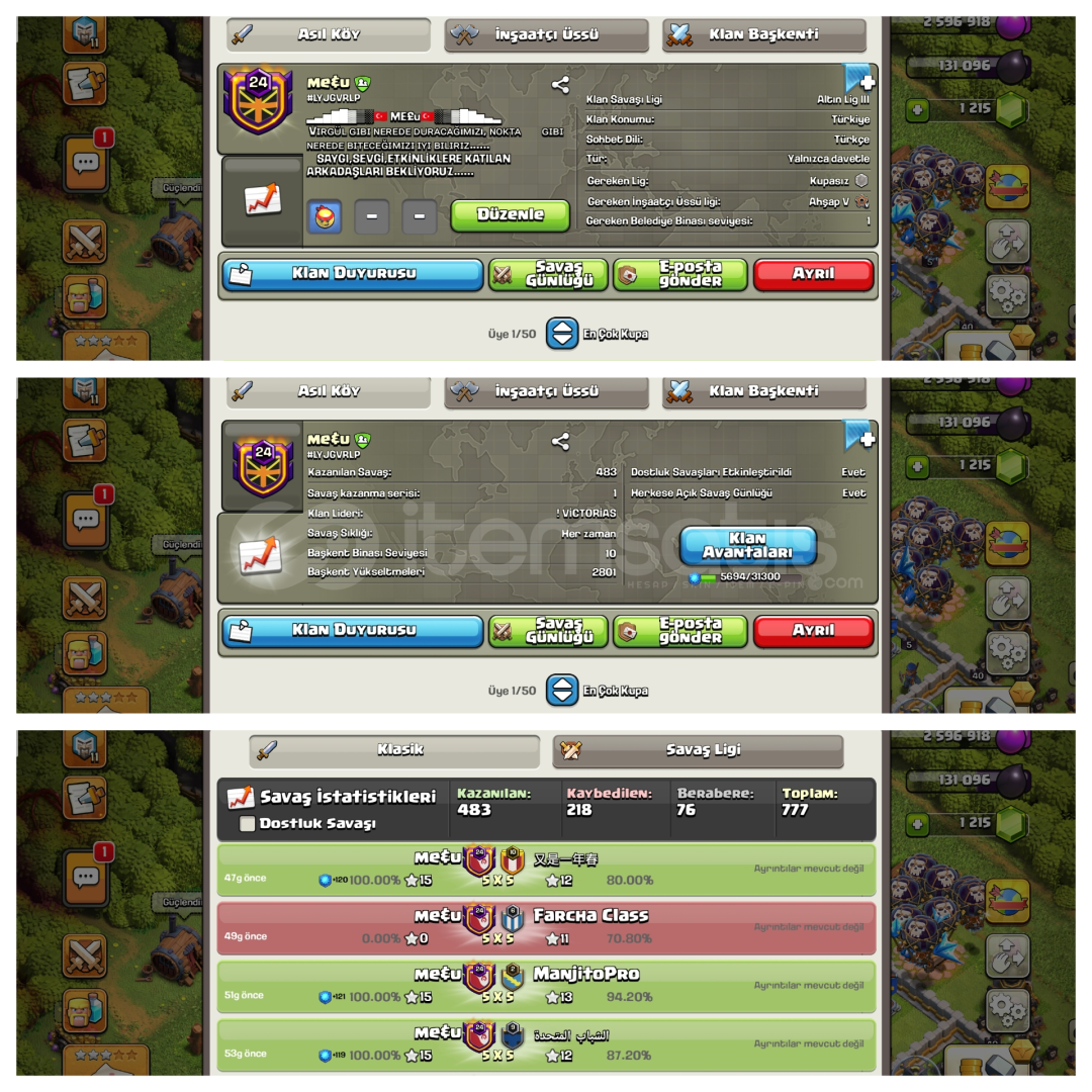 10/10 DEĞERLENDİRME PUANIAÇIKLAMAYI LÜTFEN SONUNA KADAR OKUYUNUZ !HESABIN EK ÖZELLİKLERİ ⚡️ ✨ 25 AZ KALMIŞ• Me£u• Eşi Benzeri Yok !• Harika Savaş Günlüğü• altın 1 ligi • Başkent Seviyesi 10• Başkent Yükseltmesi 2800• Alıcısına Hayırlı Olsun- Her Zaman En İyi Şekilde Hizmet Vermeye Çalışıyo...