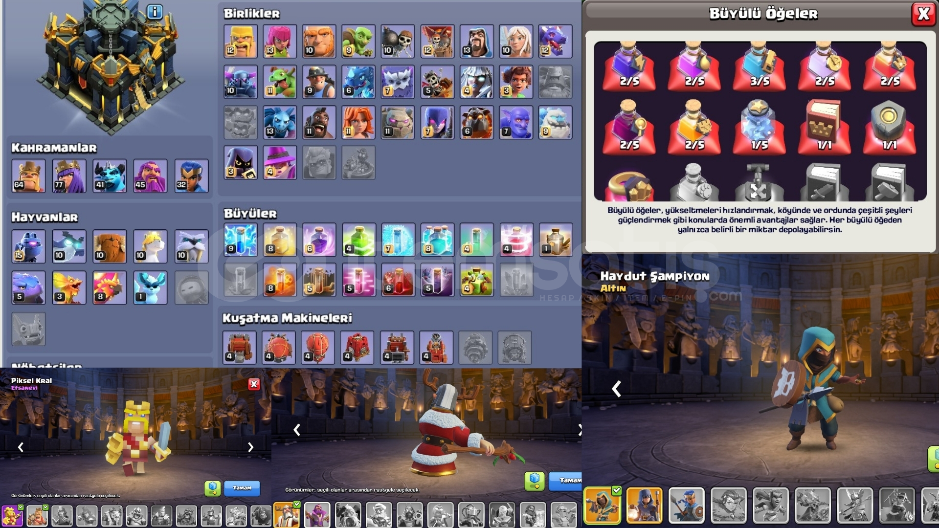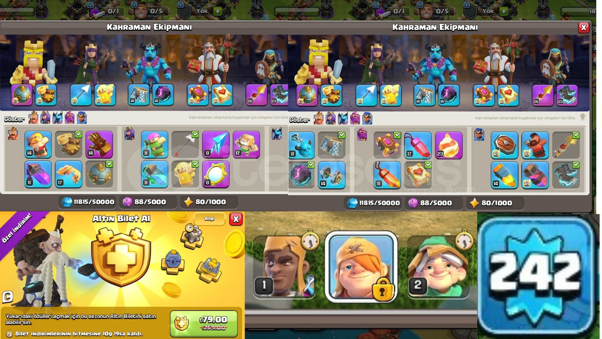242 LEVEL HESAP , ALTIN BİLET İNDİRİMLİ.2706 KLAN SAVAŞI YILDIZI , DOLU DOLU BÜYÜLÜ ÖĞELER.EKİPMANLAR ÇOK SAĞLAM NEREDEYSE HEPİ MAX.LAB ÇOK SAĞLAM , HEROLAR VE DUVARLAR HARİCİ BB17 MAX HESAP.HESAPLAR 100/100 GÜVENCE İLE TESLİM EDİLİR BİR SORUNUZ OLURSA SORMAKTAN ÇEKİNMEYİN.