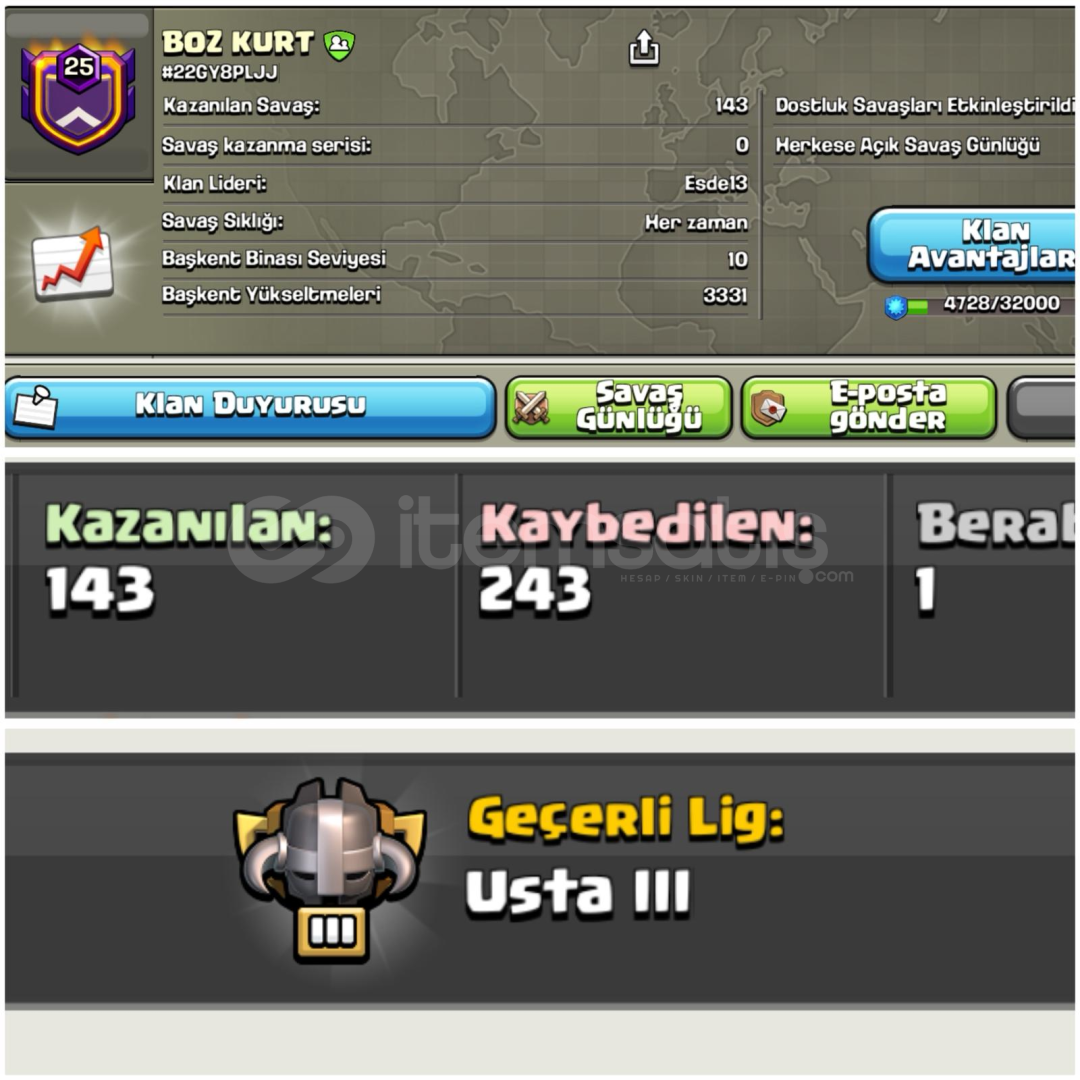 %100 MEMNUNİYET | 1 DAKİKADA TESLİM ⏳|10/10 DEĞERLENDİRME PUANIAÇIKLAMAYI LÜTFEN SONUNA KADAR OKUYUNUZ !HESABIN EK ÖZELLİKLERİ ⚡️ ✨25 Level Klanım • BOZ KURT 🇹🇷• Harika Savaş Günlüğü• USTA III Savaş Ligi • Başkent Seviyesi 10• Başkent Yükseltmesi 3331• Görsellerde Belirtilmiştir.• Alıcıs...