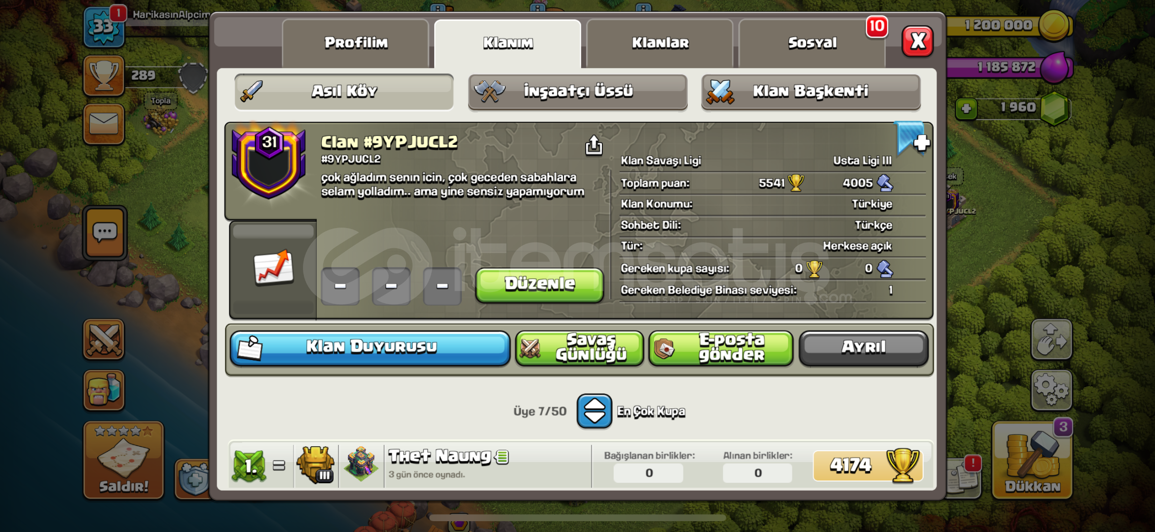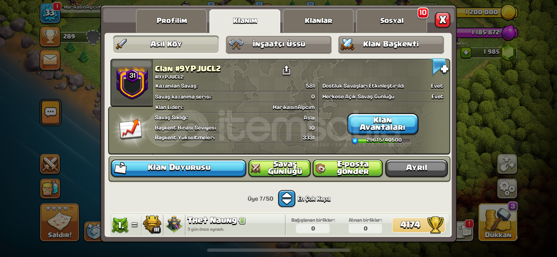 31 LVL İSTEDİĞİNİZ İSMİ YAPABİLİRSİNİZUSTA lll LİG DERECESİGÜZEL GÜNLÜKMAX+MAX BAŞKENTDAHA SAĞLAM ÇOK AZ KLAN VAR