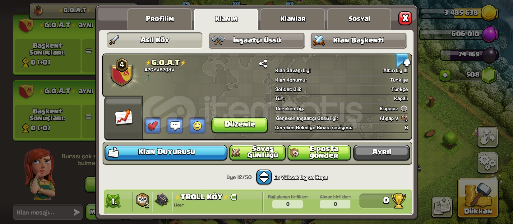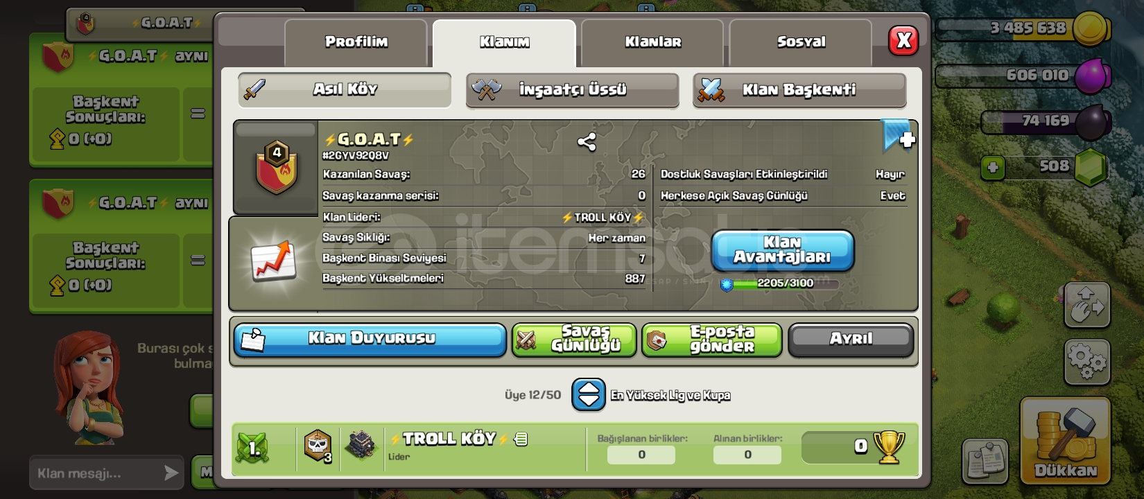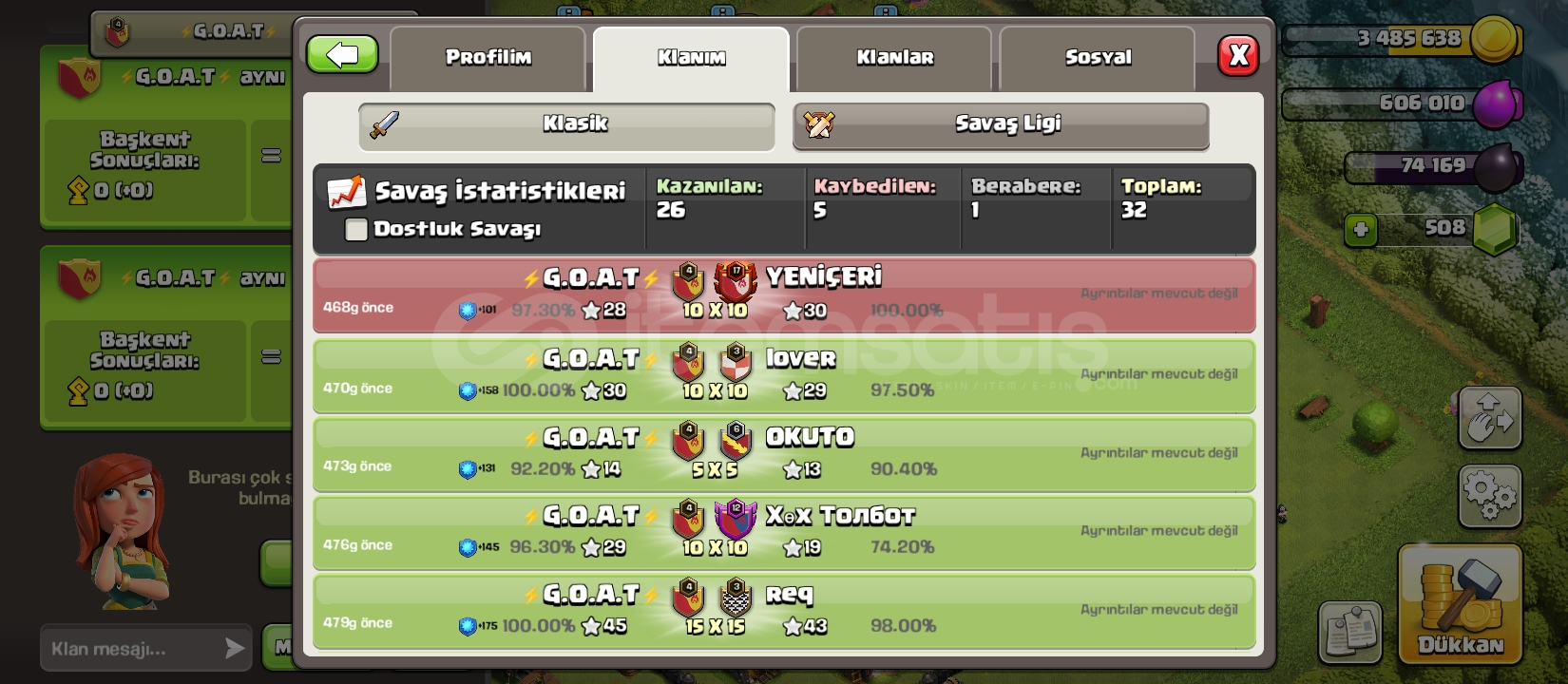 ⭐KLAN HAKKINDA BİLGİ ⭐"Satın alımınız sonrası sizin verdiğiniz İD deki hesaba Liderlik Devredilecektir"KLAN 4 LEVELDİR...Başkent Binası 7. Seviyedir...klanın 5 LvL olmasına az kalmıştır...klan Ligi Altın 3'tür...Klan başlangıç olarak iyidir...Savaş Günlüğü:26 Kazanma, 5 Kaybetme, 1 Beraberlik.Bizi Tercih Ettiğiniz için teşekkü...