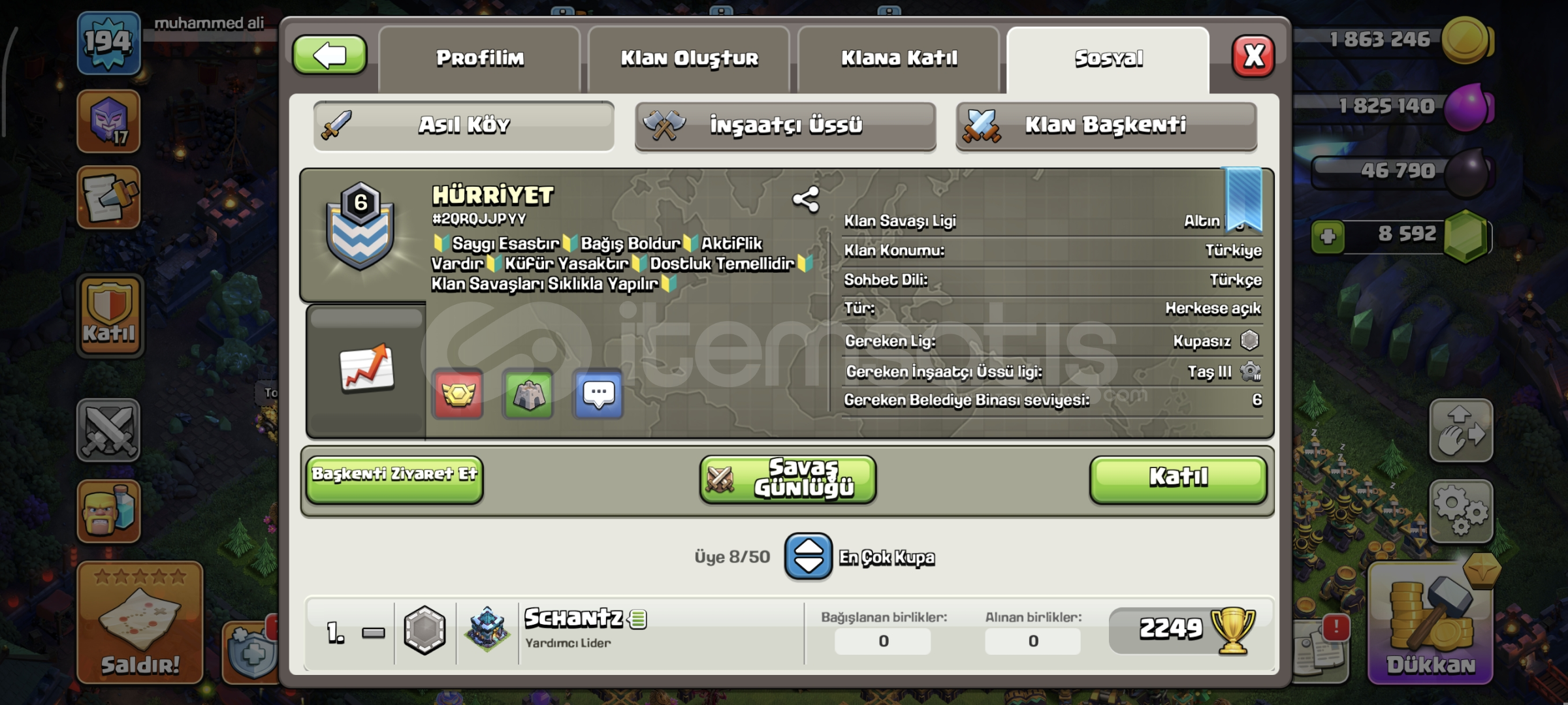 HESAP GAYET UYGUNDUR İLANI ALDIĞINIZDA LİDERLİĞİ SİZE DEVREDECEĞİM VE KLANDAN ÇIKACAĞIMEKSTRA OLARAKKLANI UZUN ZAMAN KULLANDIK VE ŞUANDA AKTİF OLARAK KULLANMIYORUZ LİG ALTIN 3BAŞKENT 6 SEVİYEDİR KLANIN İSMİDE GÜZEL ALAN KİŞİYE SİMDİDEN HAYIRLI OLSUN