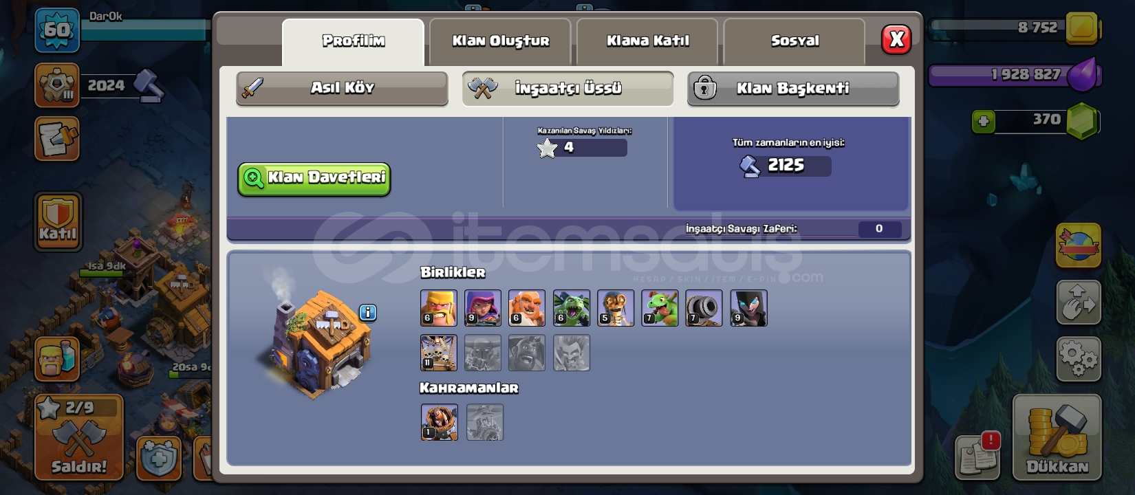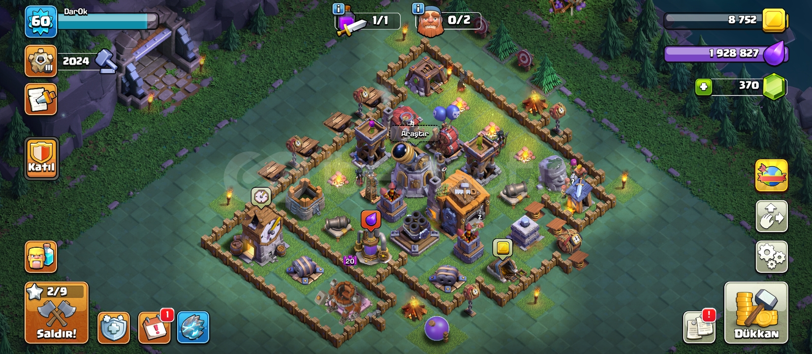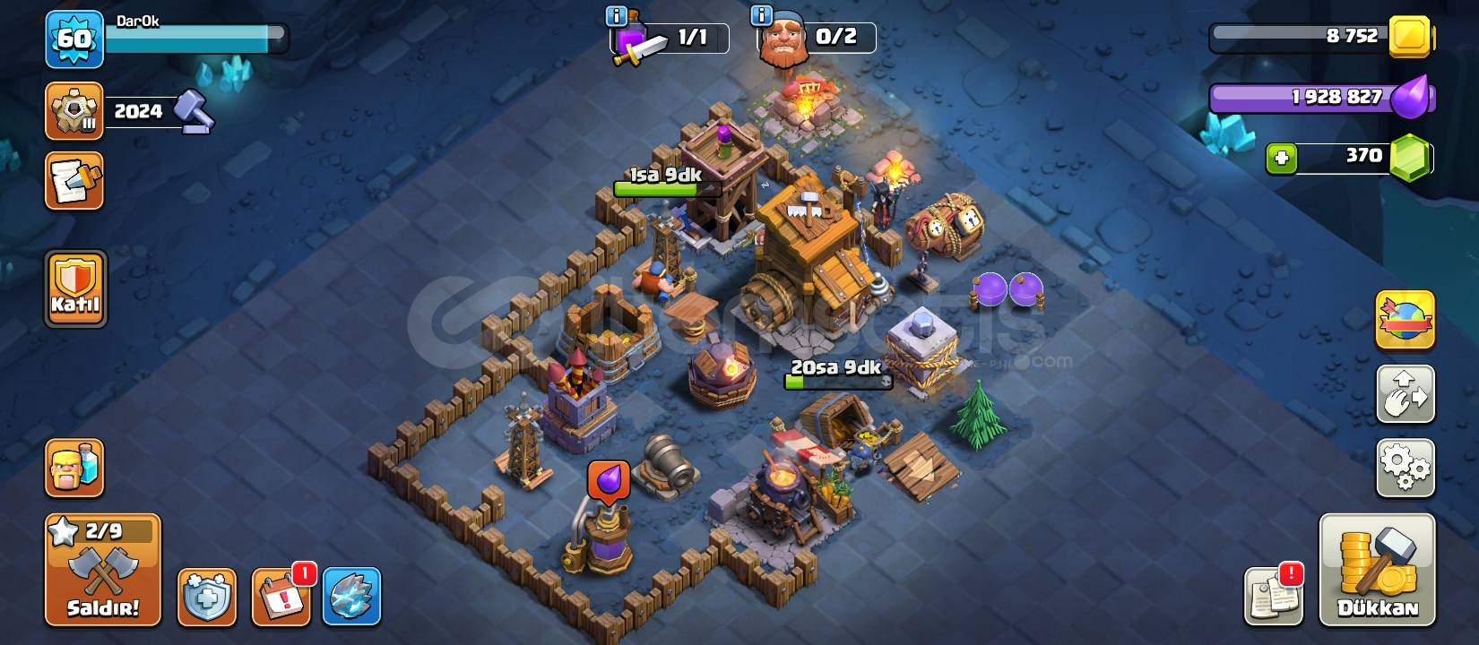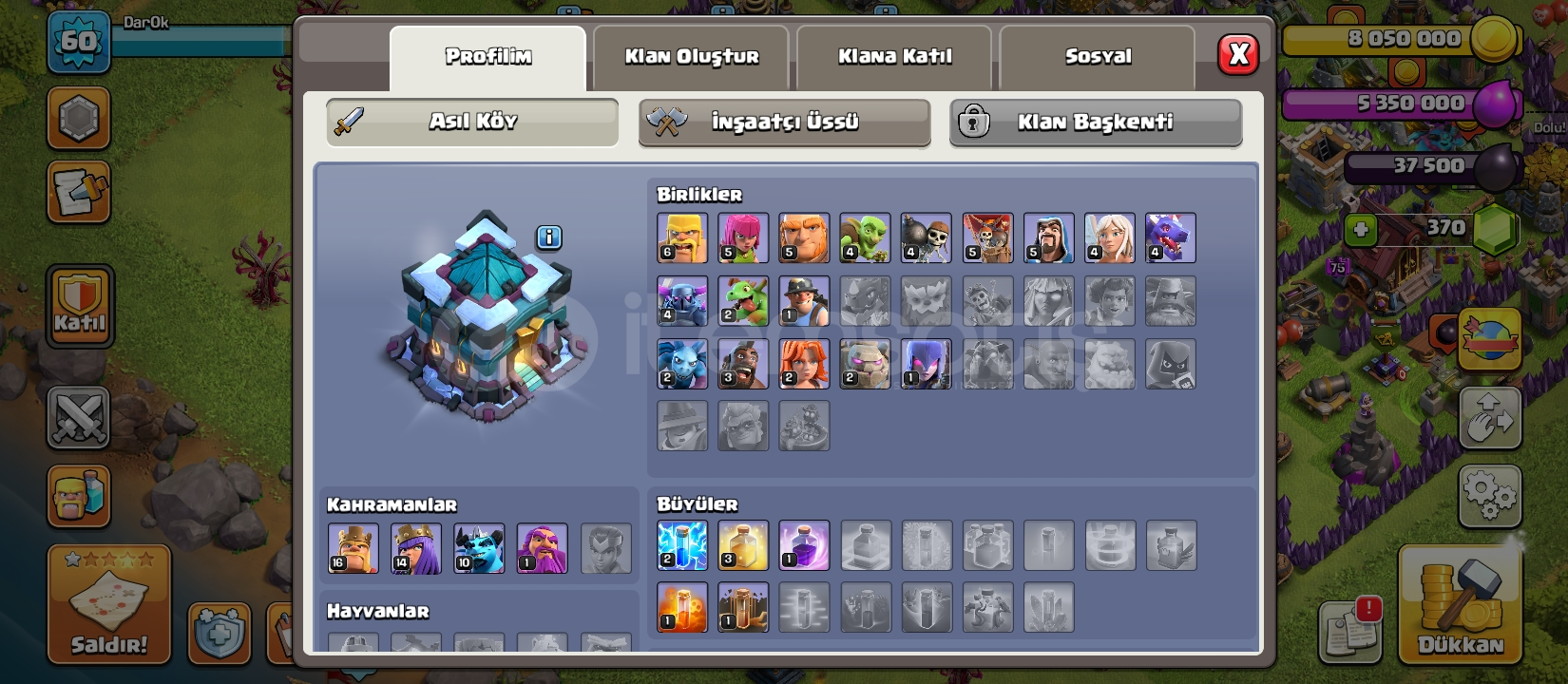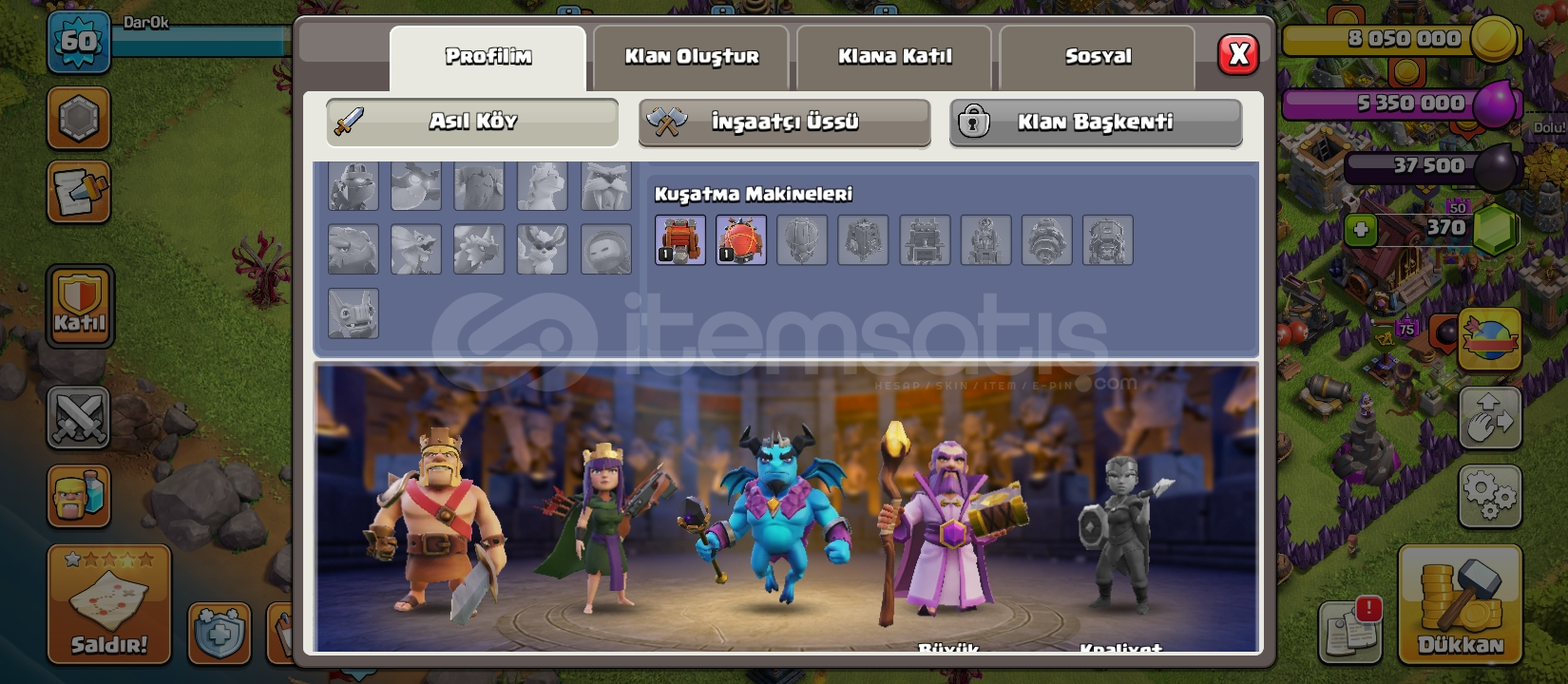 Hesap 60LVL'dirHesapta 8.000.000 altın bulunmaktadırHesapta 5.350.000 iksir bulunmaktadırHesapta 37.500 kara iksir bulunmaktadırHesapta 370 Taş bulunmaktadır