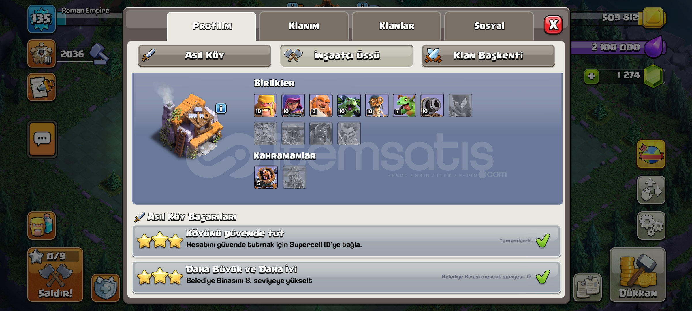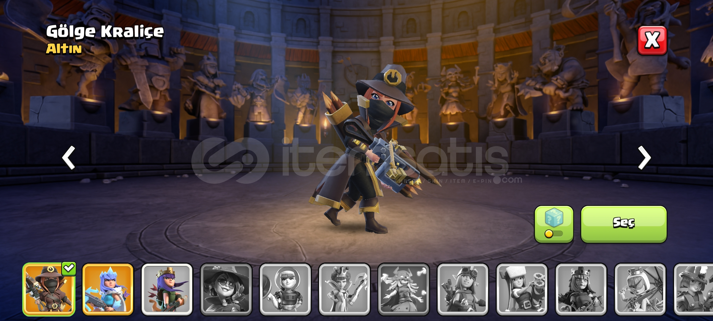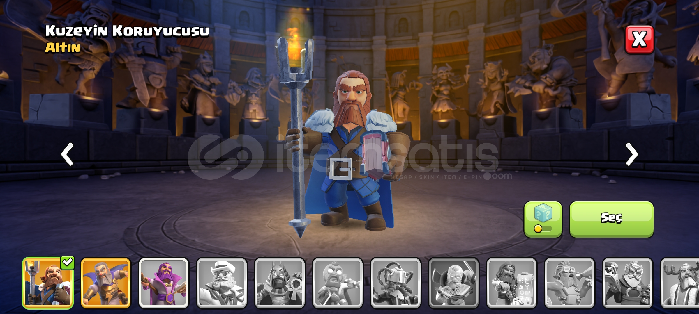 Hesap lig seviyesi okçu 9'dur7 skin vardır (1 efsanevi+6 altın)belediye binası seviyesi 12'dir1260 taş vardırHesap oto...
