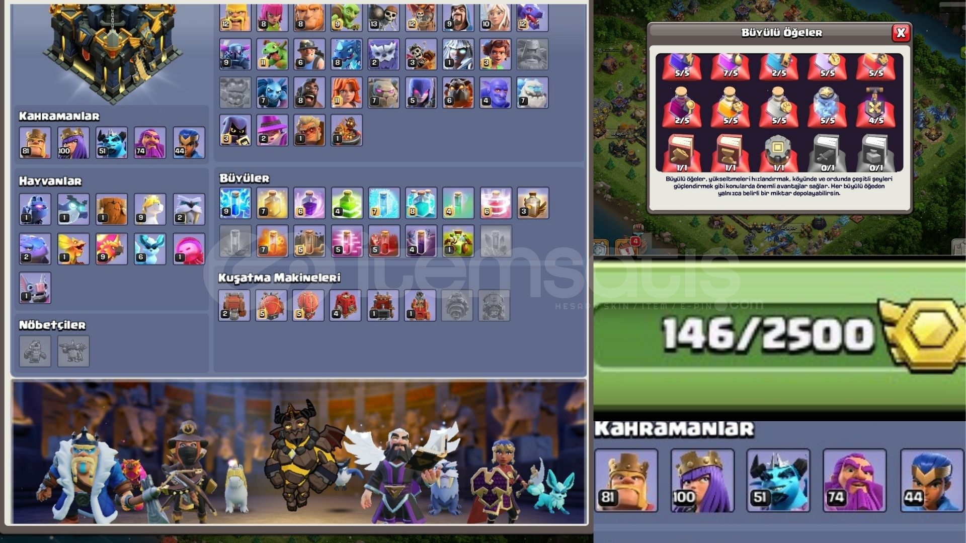 DUVARLAR MAX SAVUNMALAR MAXA YAKIN.8150 TAŞ , 8 SEVİYE LAB ASİSTAN , ÇIRAK 8 SEVİYE MAXX , 1 SEVİYE SİMYACI.146 LİG MADALYASI , HEROLAR NERDEYSE MAX , DOLU DOLU BÜYÜLÜ ÖĞE.3 ADET EFSANEVİ KOSTÜM , 5 ADET ALTIN KOSTÜM , EKİPMANLAR SAĞLAM.HESAPLAR 100/100 GÜVENCE İLE TESLİM EDİLİR BİR SORUNUZ OLURSA SORMAKTAN ÇEKİNMEYİN.