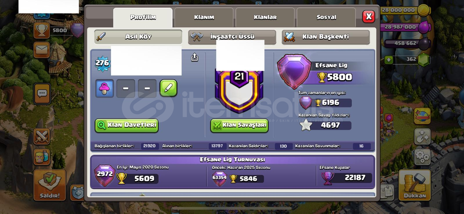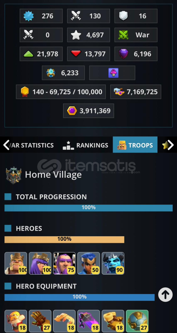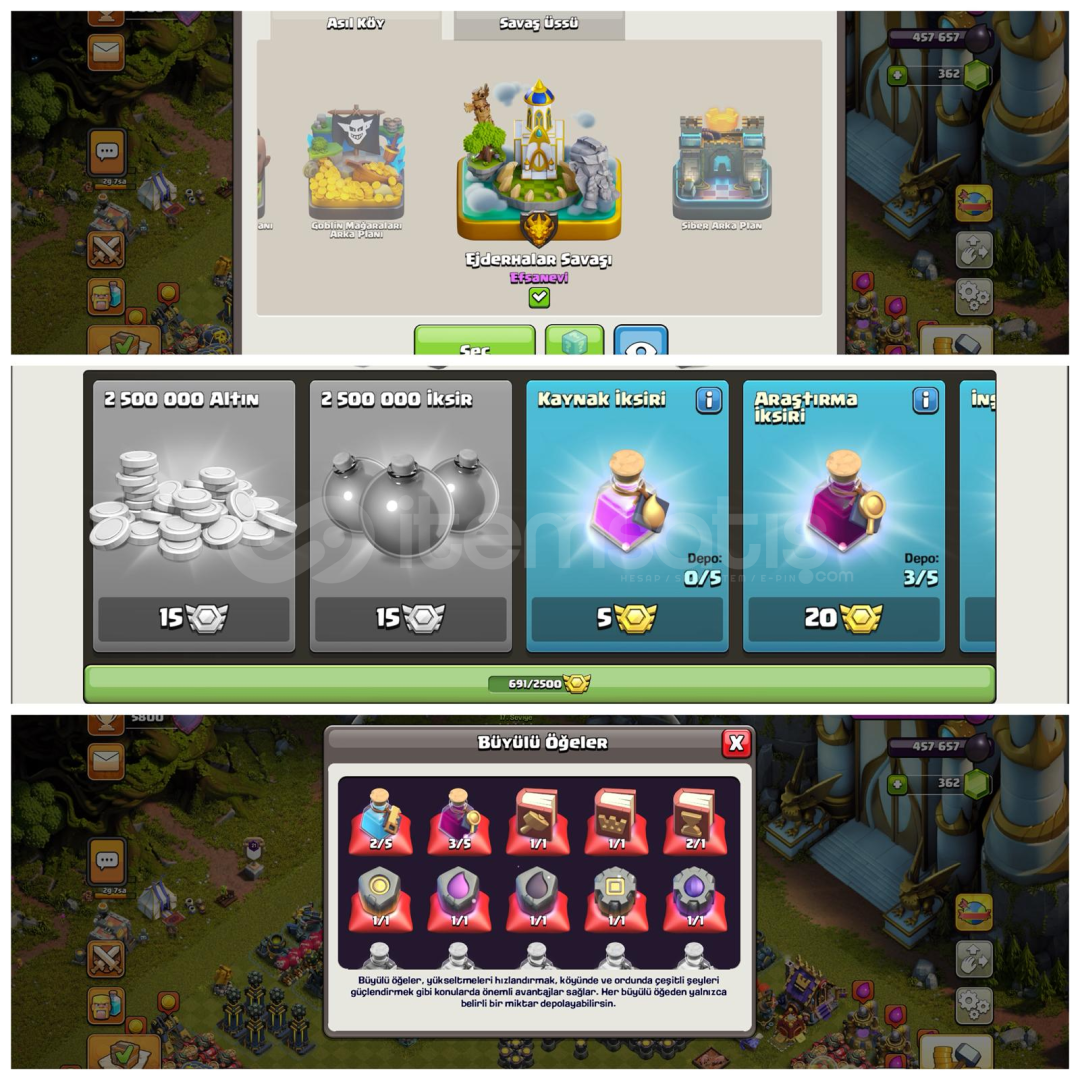 Hesap güncel olarak 4697 savaş yıldızı bulunup global bir hesaptır. Görsellerde görüldüğü üzere bol kostüm ve arka planlı olup köyün %100'ü bitmiştir. Büyülüğü öğeleri ve 701 adet lig madalyaları storda bulunan altın biletleri ile belediye binası 18'de zorlanmayacaksınız. Dosta gidecek bir hesaptır. Pazarlık sünnettir. Alıcısına şimdiden hayırlı olsun..