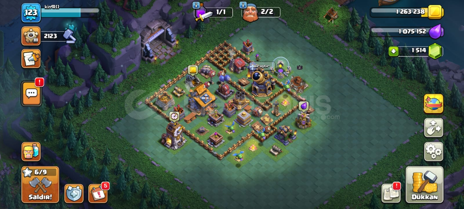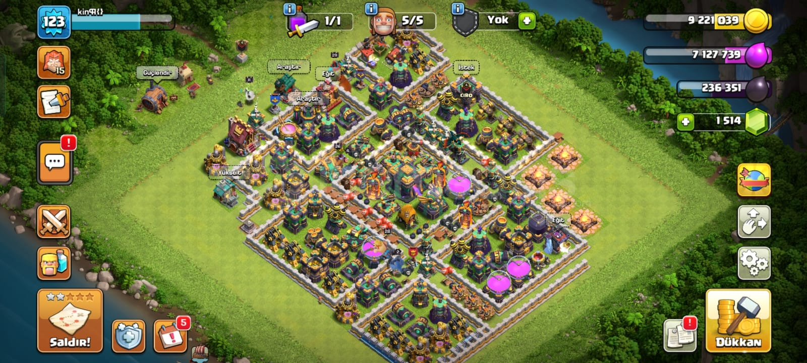 HESAPTA BELEDİYE BİNASI 14 SEVİYE 1,500 ELMAS 30,000 BAŞKENT ALTINI VE HESABIN 5 İNŞATCISI ACIK HESABIN KENDİ KLANI 5 SEVİYE KLAN 10 SEVİYE İNŞAATCI BİNASI HESAP SEVİYESİ 123