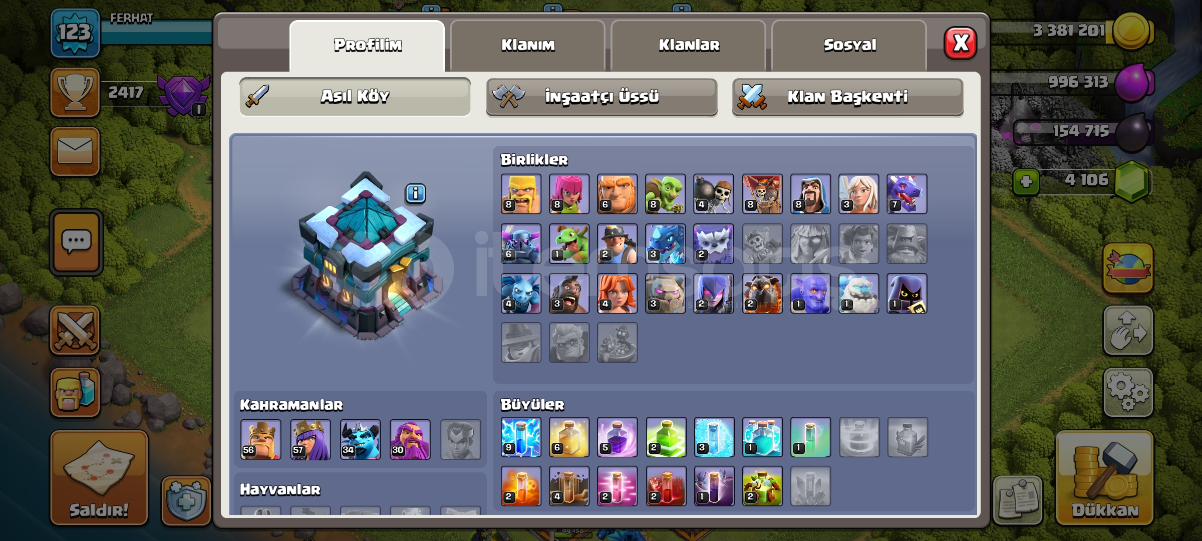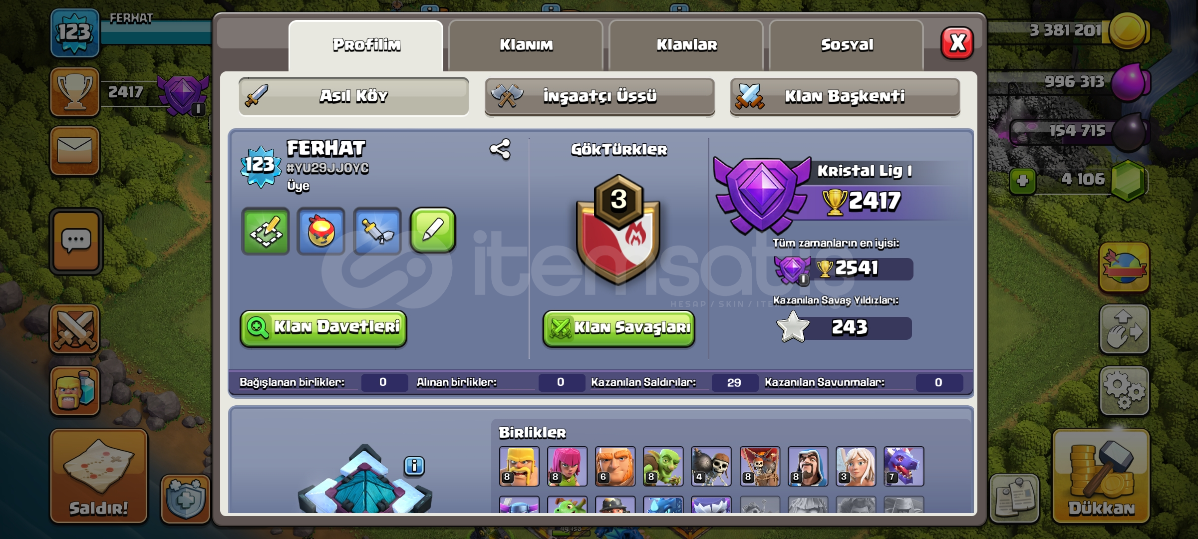 ACİL SATILIK COC HESABIHESAP BANA AİTTİR.+4000 BİN TAS BULUNUYOR.HESAP 13 BELEDİYE 4 YILDIZDIR.SADECE SUPERCELL BAĞİ VARDIR.HESAP 123 SEVİYEDİR.BARBAR KRALIN ÖZEL KOSTUMU VARDIRDİĞER KARAKTERLER İÇİN ELMAS BULUNUYOR.YENİ ALICISINA HAYIRLI OLSUN.