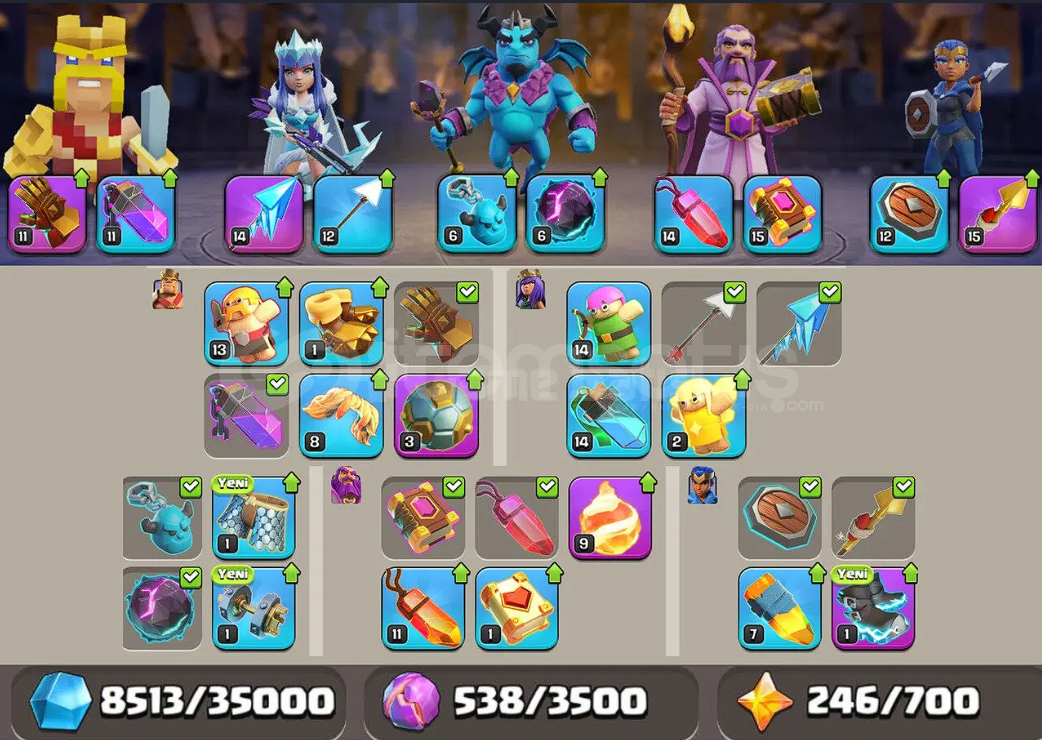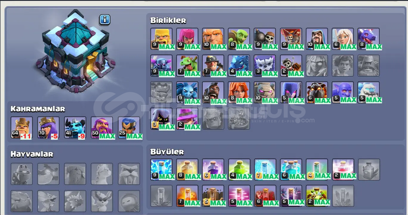Öncelikle hesaba kendiniz bu koddan bakabilirsiniz. #20CGR2Y9GAklınızda soru işareti kalmasın diye uzunca hesabın bütün özelliklerini yazdım, dikkatlice okuyun :Köy belediye binası 13ün max olmasına çok az kalmıştır170 Seviye bir hesaptır.Bütün birlikler ve büyüler MAX seviyedir.Bütün binalar MAX seviyedir.Fotoğraflarda kahramanların seviyeleri gözükm...
