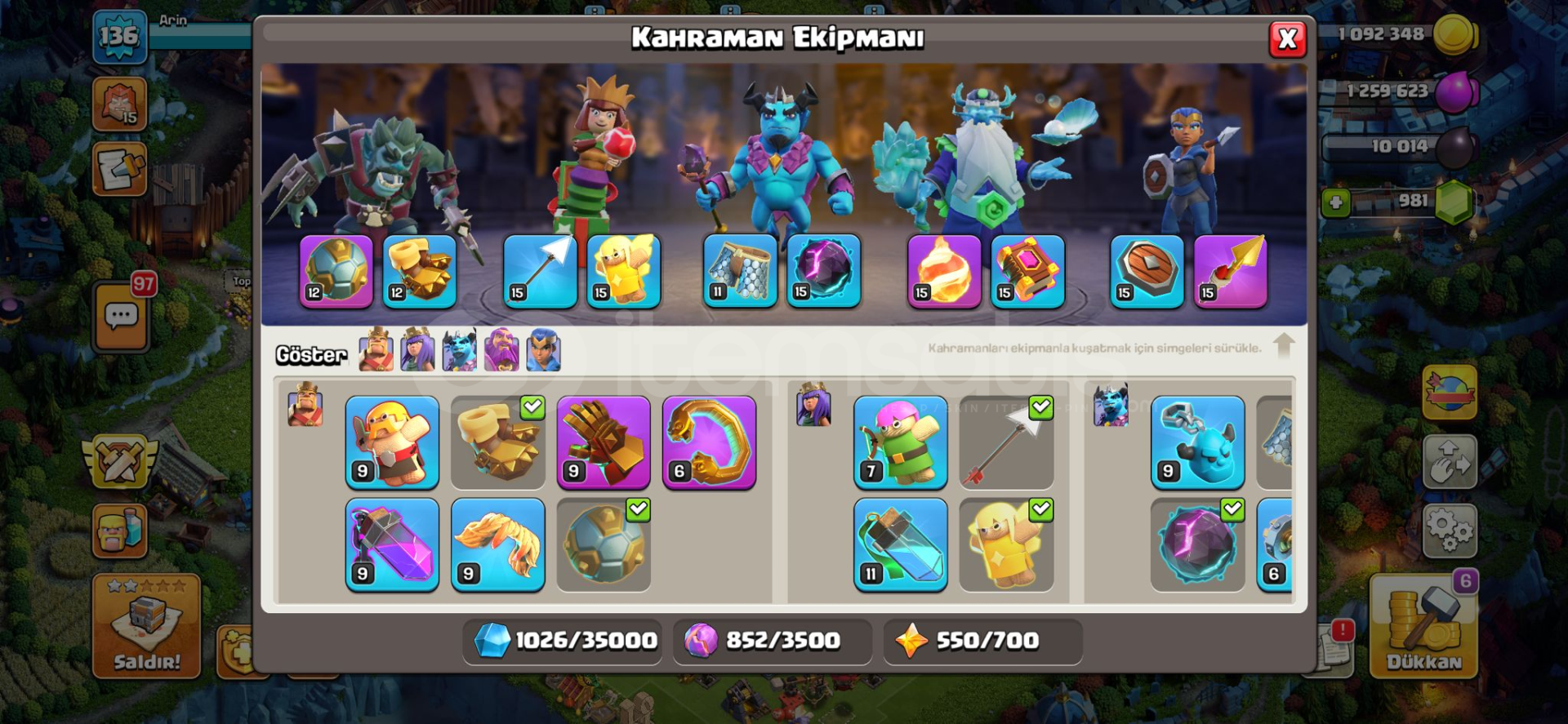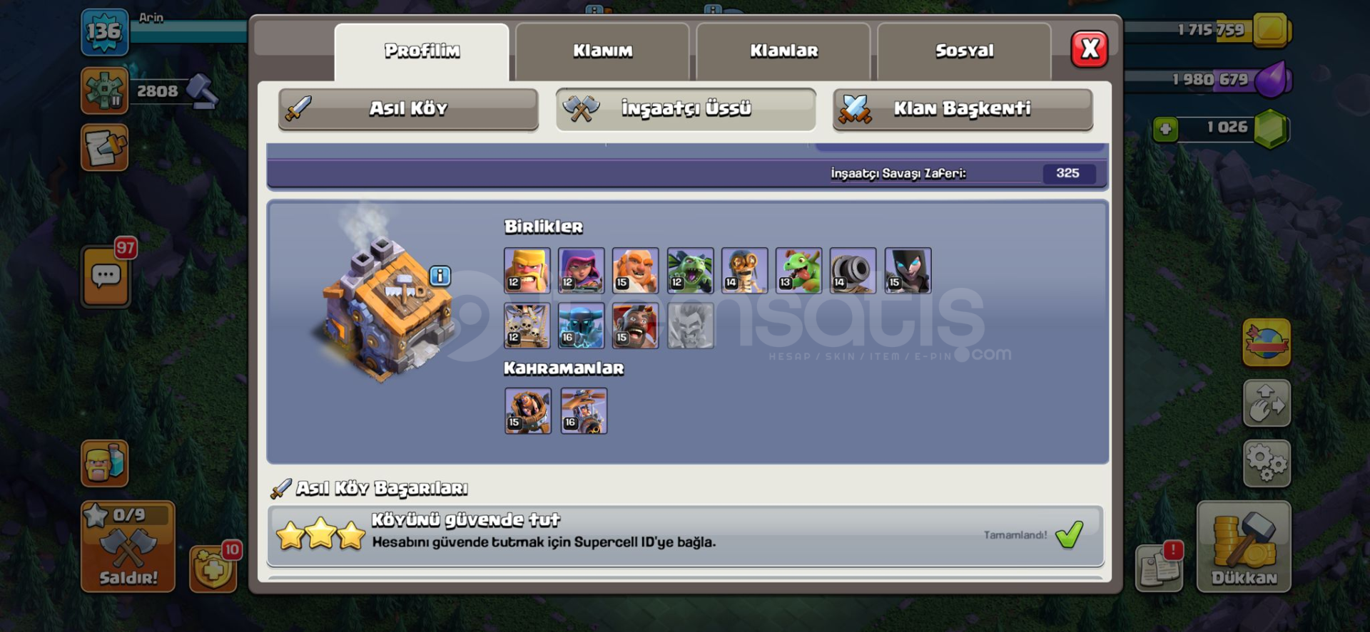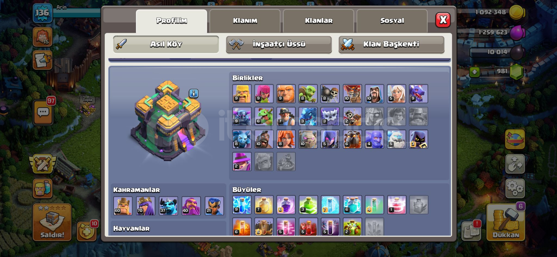 Clash of Clans hesabı:14 seviye belediye binası136 seviye7 hero kostümübüyülü ögelerin çoğu var+1000 taşad değiştirme varyarı max1 ücretli 1 pass arka planı5 max askerkral 60 kraliçe 70 prens 37 koruyucu 40 şampiyon 21 seviye5 inşaatçı var ama 6. inşaatçı yarılanmış halde Clash royale hesabı:9600 kupa19 evrim4 elit-7 tane 14 seviye kart10 efsanevi 14...